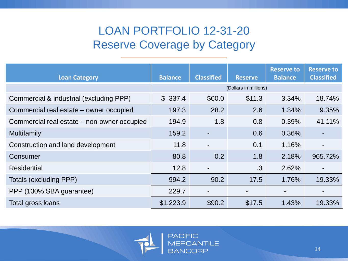 LOAN PORTFOLIO 12-31-20 Asset Quality Ratings by Category _________________________________ 13 Loan Category Pass Special Mention Sub Standard Doubtful Total (Dollars in millions) Commercial & industrial $493.4 $13.7 $59.4 $0.6 $567.1 Commercial real estate – owner occupied 162.2 6.9 28.2 - 197.3 Commercial real estate – non-owner occupied 192.3 0.8 1.8 - 194.9 Multifamily 158.8 0.4 - - 159.2 Construction and land development 11.8 - - - 11.8 Consumer 80.6 - 0.2 - 80.8 Residential 12.8 - - - 12.8 Totals $1,111.9 $21.8 $89.6 $0.6 $1,223.9