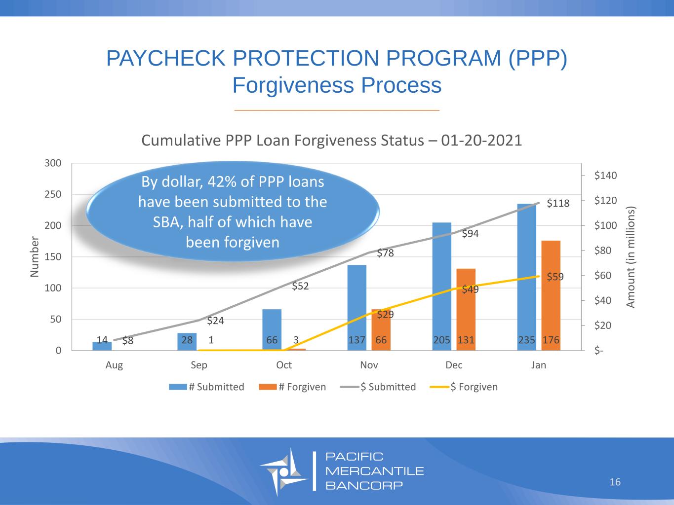 PAYCHECK PROTECTION PROGRAM (PPP) Forgiveness Process _________________________________ 16 14 28 66 137 205 2351 3 66 131 176$8 $24 $52 $78 $94 $118 $29 $49 $59 $- $20 $40 $60 $80 $100 $120 $140 0 50 100 150 200 250 300 Aug Sep Oct Nov Dec Jan A m o u n t (i n m il li o n s) N u m b e r Cumulative PPP Loan Forgiveness Status – 01-20-2021 # Submitted # Forgiven $ Submitted $ Forgiven By dollar, 42% of PPP loans have been submitted to the SBA, half of which have been forgiven