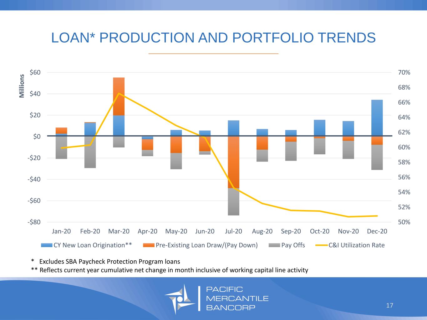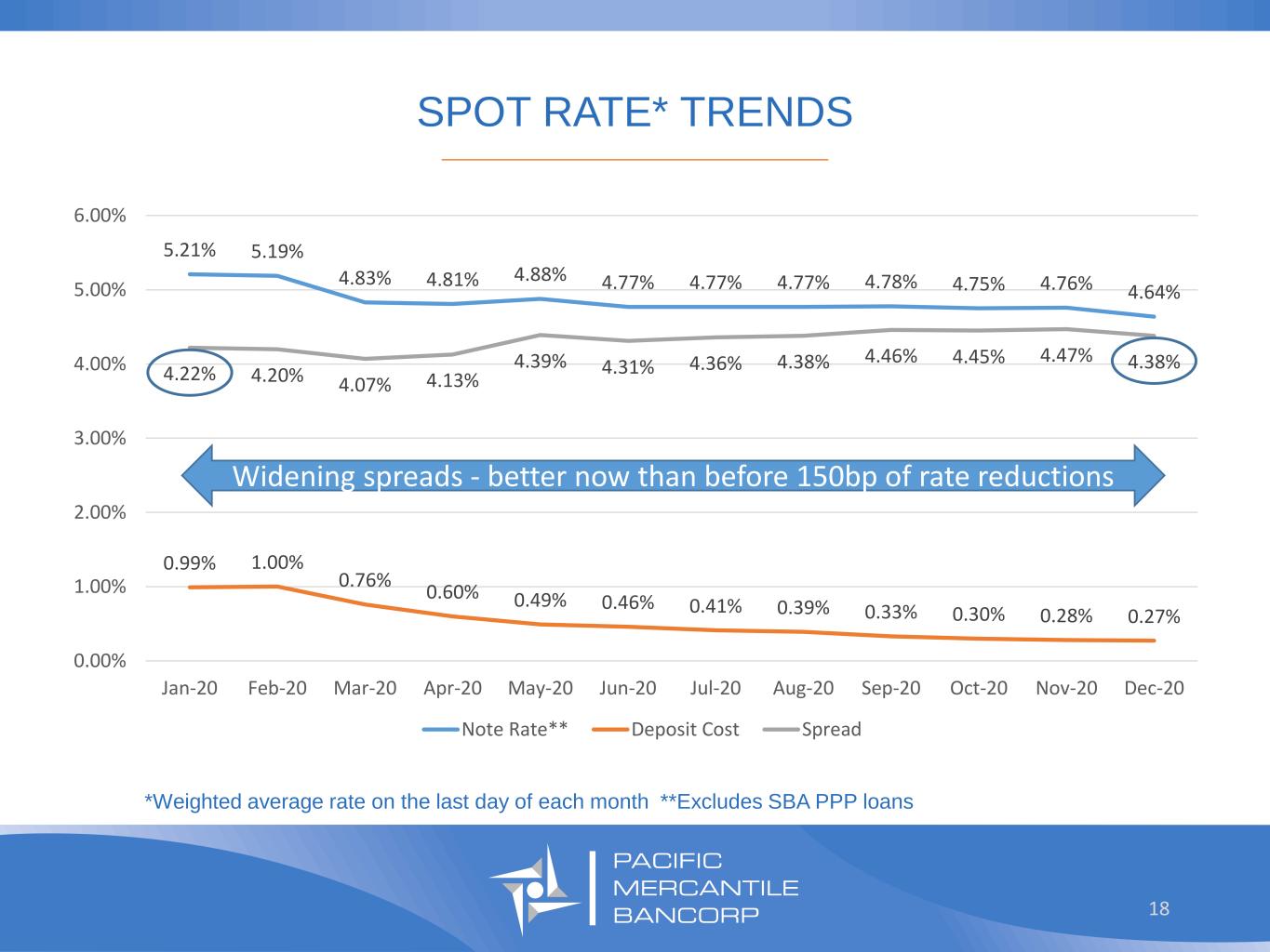 LOAN* PRODUCTION AND PORTFOLIO TRENDS _________________________________ 17 50% 52% 54% 56% 58% 60% 62% 64% 66% 68% 70% -$80 -$60 -$40 -$20 $0 $20 $40 $60 Jan-20 Feb-20 Mar-20 Apr-20 May-20 Jun-20 Jul-20 Aug-20 Sep-20 Oct-20 Nov-20 Dec-20 M il li o n s CY New Loan Origination** Pre-Existing Loan Draw/(Pay Down) Pay Offs C&I Utilization Rate * Excludes SBA Paycheck Protection Program loans ** Reflects current year cumulative net change in month inclusive of working capital line activity