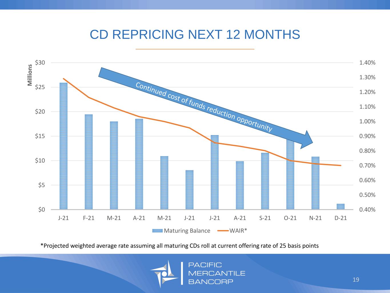 CD REPRICING NEXT 12 MONTHS _________________________________ 19 0.40% 0.50% 0.60% 0.70% 0.80% 0.90% 1.00% 1.10% 1.20% 1.30% 1.40% $0 $5 $10 $15 $20 $25 $30 J-21 F-21 M-21 A-21 M-21 J-21 J-21 A-21 S-21 O-21 N-21 D-21 M il li o n s Maturing Balance WAIR* *Projected weighted average rate assuming all maturing CDs roll at current offering rate of 25 basis points