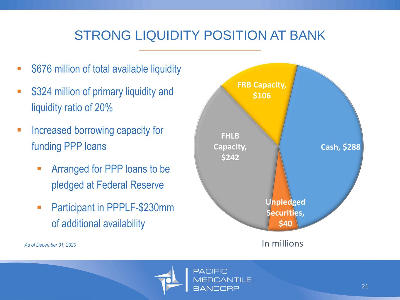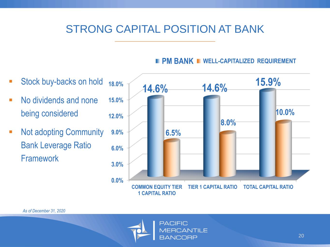 STRONG CAPITAL POSITION AT BANK _________________________________ 0.0% 3.0% 6.0% 9.0% 12.0% 15.0% 18.0% COMMON EQUITY TIER 1 CAPITAL RATIO TIER 1 CAPITAL RATIO TOTAL CAPITAL RATIO 14.6% 14.6% 15.9% 6.5% 8.0% 10.0% PM BANK WELL-CAPITALIZED REQUIREMENT 20 As of December 31, 2020 Stock buy-backs on hold No dividends and none being considered Not adopting Community Bank Leverage Ratio Framework