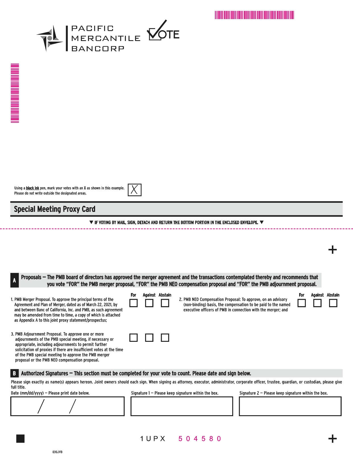 Your vote is very important. To ensure your representation at the BOC special meeting or the PMB special meeting, as applicable, please complete and return the enclosed proxy card or submit your proxy by telephone or through the Internet. Whether or not you expect to attend the respective special meeting, please vote promptly. Submitting a proxy now will not prevent you from being able to vote your shares via the Internet during the BOC special meeting or in person at the PMB special meeting.