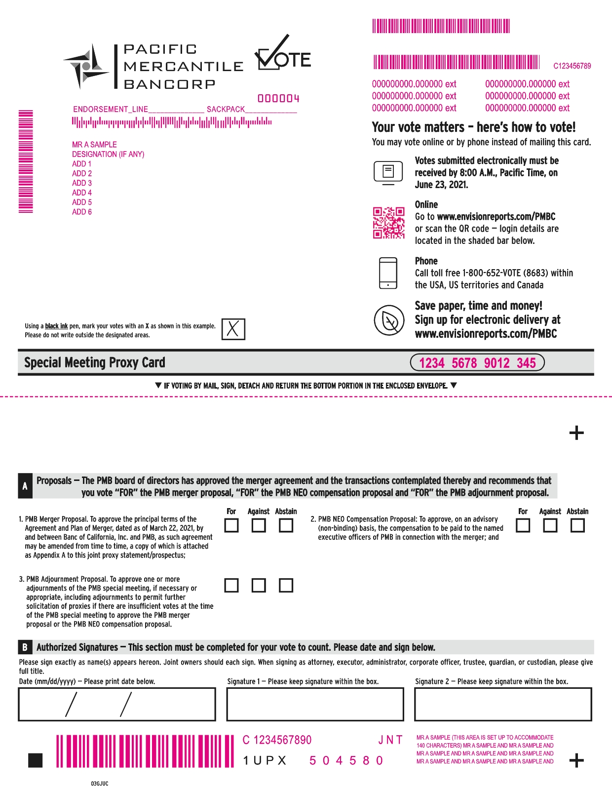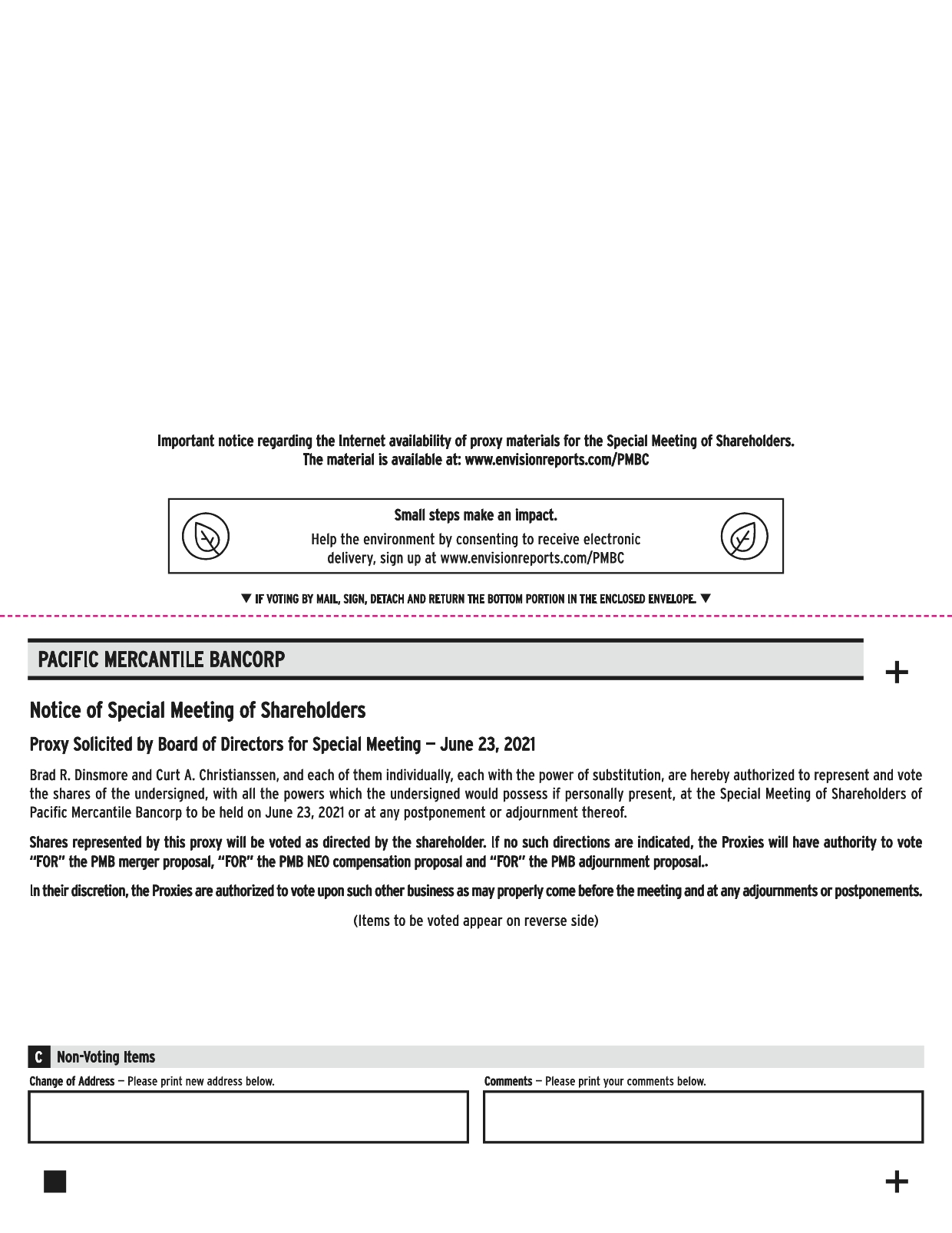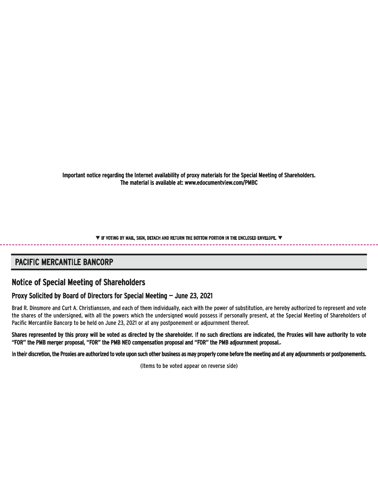 The special meeting of shareholders of PMB will be held in the first floor Training Room at PMB’s offices at 949 South Coast Drive, Costa Mesa, California 92626 on Wednesday, June 23, 2021, which we refer to as the PMB special meeting, to approve the following proposals:
