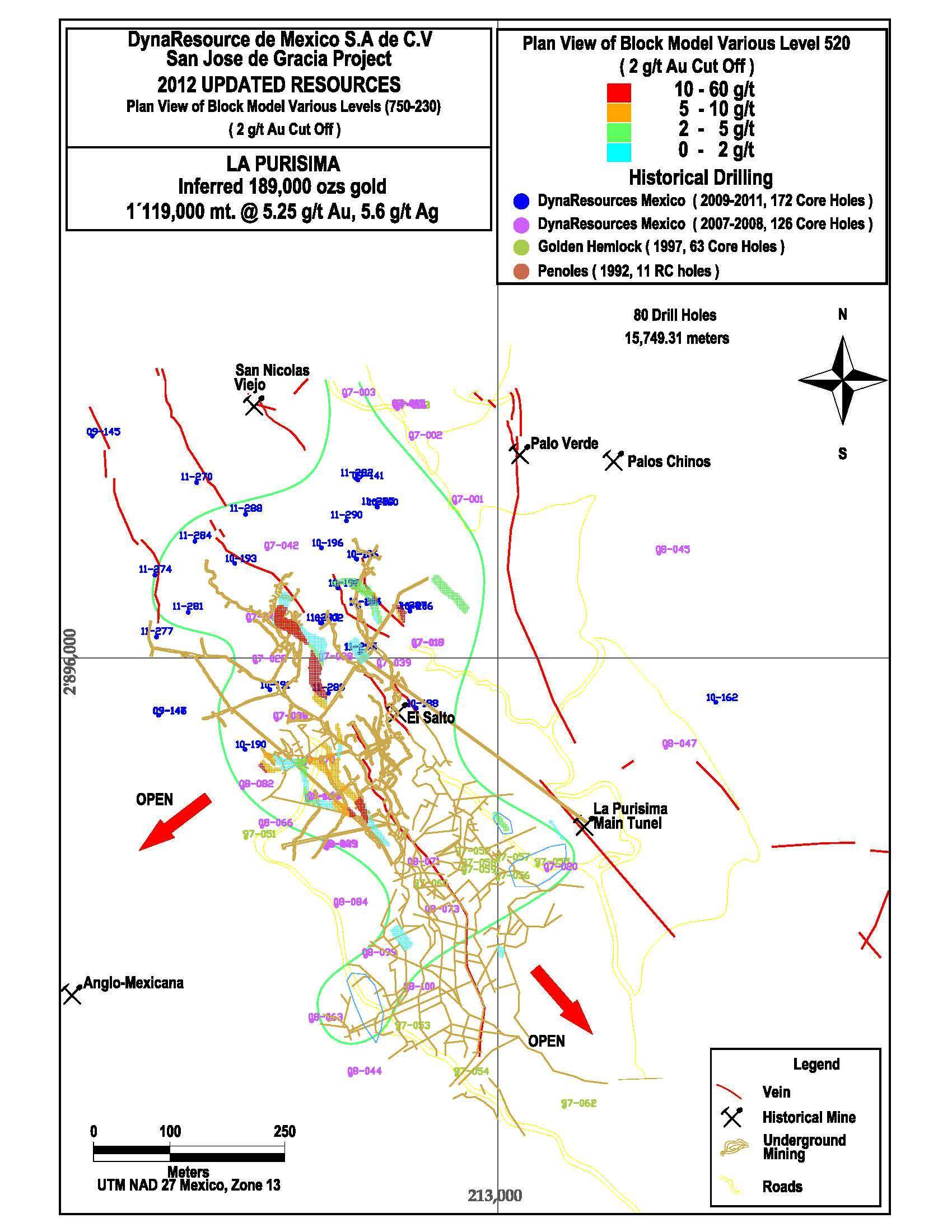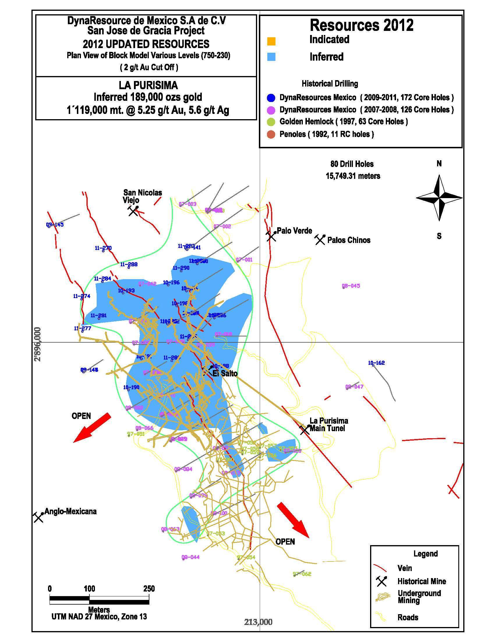 Because there are no precise quantitative definitions of measured, indicated and inferred, resource classification is subjective and depends on the experience and judgment of the Qualified Person (“QP”) doing the resource. Veins are normally planar structures and three points determine a plane, with a fourth point providing a check. CAM required a minimum of seven sample-data points. CAM allowed indicated resources at Tres Amigos and San Pablo because of the fact that two of the veins had a significant number of holes (62 and 82 respectively), and the fact that there was historic production by DynaMexico from San Pablo of some 42,000 tonnes of plant feed at an average grade of approximately 15 g/t. Three of the individual veins at La Purisima satisfied criteria (1) above but CAM elected not to include this material in indicated because of the higher nugget effect at la Purisima, and because there was apparently considerable historic underground mining there. As discussed under Sampling, prior underground mining does not appear to be a significant issue as based on the drilling, this mineral resource estimate does not include any ore loss or dilution outside wireframes, and is probably most appropriate for a highly selective, small equipment underground operation.