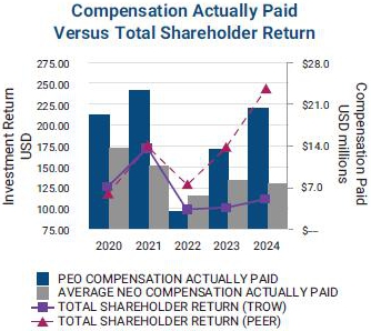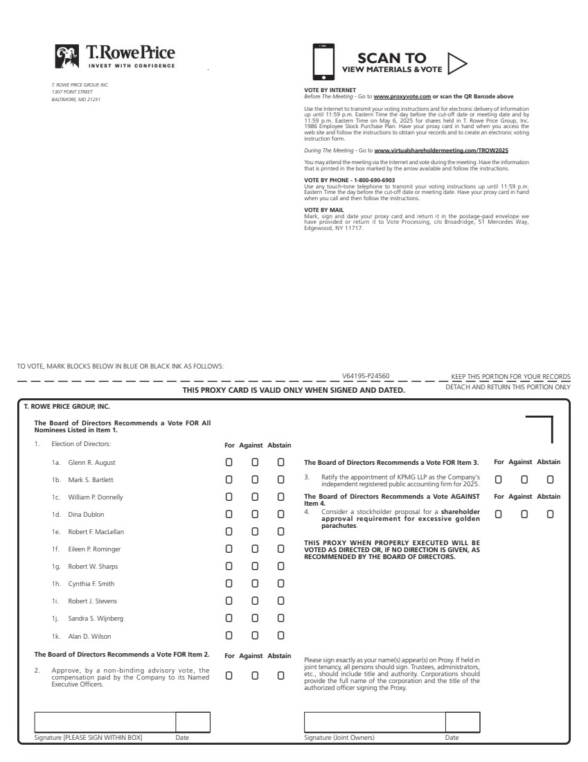 | Signature [PLEASE SIGN WITHIN BOX] Date Signature (Joint Owners) DateTO VOTE, MARK BLOCKS BELOW IN BLUE OR BLACK INK AS FOLLOWS: KEEP THIS PORTION FOR YOUR RECORDS DETACH AND RETURN THIS PORTION ONLY THIS PROXY CARD IS VALID ONLY WHEN SIGNED AND DATED. V64195-P24560 ! ! ! ! ! ! T. ROWE PRICE GROUP, INC. 1307 POINT STREET BALTIMORE, MD 21231 ! ! ! ! ! ! ! ! ! ! ! ! ! ! ! ! ! ! ! ! ! ! ! ! ! ! ! ! ! ! ! ! ! ! ! ! T. ROWE PRICE GROUP, INC. 1b. Mark S. Bartlett 1a. Glenn R. August 1c. William P. Donnelly 1d. Dina Dublon 1e. Robert F. MacLellan 1f. Eileen P. Rominger 1h. Cynthia F. Smith 1i. Robert J. Stevens 1g. Robert W. Sharps 1. Election of Directors: The Board of Directors Recommends a Vote FOR All Nominees Listed in Item 1. 1j. Sandra S. Wijnberg 1k. Alan D. Wilson 2. Approve, by a non-binding advisory vote, the compensation paid by the Company to its Named Executive Officers. The Board of Directors Recommends a Vote FOR Item 2. 3. Ratify the appointment of KPMG LLP as the Company's independent registered public accounting firm for 2025. 4. Consider a stockholder proposal for a shareholder approval requirement for excessive golden parachutes. The Board of Directors Recommends a Vote FOR Item 3. The Board of Directors Recommends a Vote AGAINST Item 4. THIS PROXY WHEN PROPERLY EXECUTED WILL BE VOTED AS DIRECTED OR, IF NO DIRECTION IS GIVEN, AS RECOMMENDED BY THE BOARD OF DIRECTORS. Please sign exactly as your name(s) appear(s) on Proxy. If held in joint tenancy, all persons should sign. Trustees, administrators, etc., should include title and authority. Corporations should provide the full name of the corporation and the title of the authorized officer signing the Proxy. For Against Abstain For Against Abstain For Against Abstain For Against Abstain VOTE BY INTERNET Before The Meeting - Go to www.proxyvote.com or scan the QR Barcode above Use the Internet to transmit your voting instructions and for electronic delivery of information up until 11:59 p.m. Eastern Time the day before the cut-off date or meeting date and by 11:59 p.m. Eastern Time on May 6, 2025 for shares held in T. Rowe Price Group, Inc. 1986 Employee Stock Purchase Plan. Have your proxy card in hand when you access the web site and follow the instructions to obtain your records and to create an electronic voting instruction form. During The Meeting - Go to www.virtualshareholdermeeting.com/TROW2025 You may attend the meeting via the Internet and vote during the meeting. Have the information that is printed in the box marked by the arrow available and follow the instructions. VOTE BY PHONE - 1-800-690-6903 Use any touch-tone telephone to transmit your voting instructions up until 11:59 p.m. Eastern Time the day before the cut-off date or meeting date. Have your proxy card in hand when you call and then follow the instructions. VOTE BY MAIL Mark, sign and date your proxy card and return it in the postage-paid envelope we have provided or return it to Vote Processing, c/o Broadridge, 51 Mercedes Way, Edgewood, NY 11717. SCAN TO VIEW MATERIALS & VOTEw |