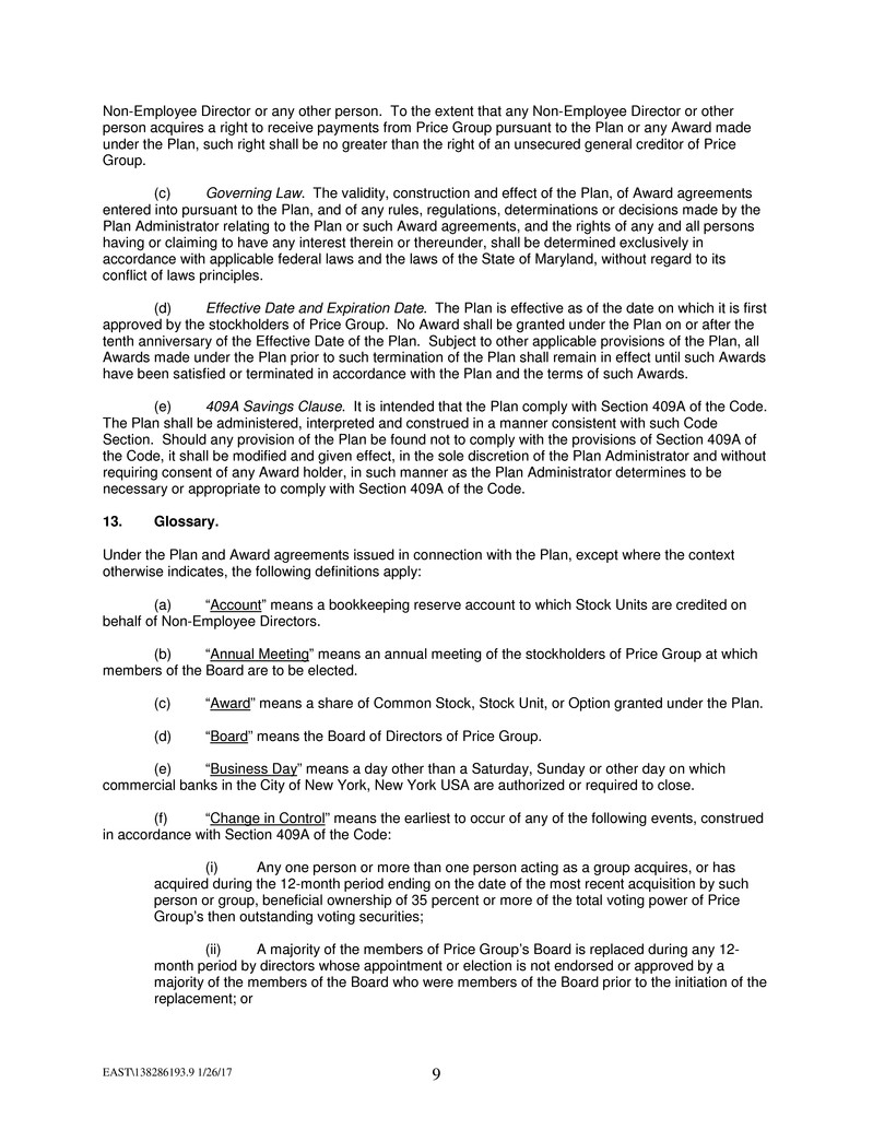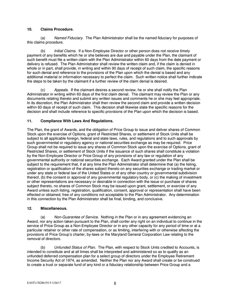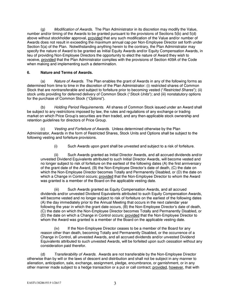 Under the Plan, Price Group may grant Non-Employee Directors equity compensation (“Awards”) in the