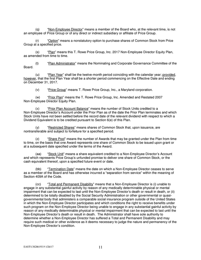 (s) “Plan” means this T. Rowe Price Group, Inc. 2017 Non-Employee Director Equity Plan,
