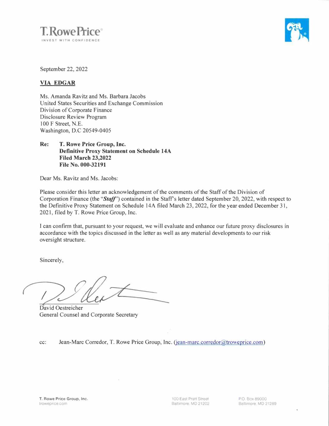 T.RowePrice INVEST WITH CONFIDENCE September 22, 2022 VIA EDGAR Ms. Amanda Ravitz and Ms. Barbara Jacobs United States Securities and Exchange Commission Division ofCorporate Finance Disclosure Review Program 1 00 F Street, N .E. Washington, D.C 20549-0405 Re: T. Rowe Price Group, Inc. Definitive Proxy Statement on Schedule 14A Filed March 23,2022 File No. 000-32191 Dear Ms. Ravitz and Ms. Jacobs: Please consider this letter an acknowledgement ofthe comments ofthe Staff ofthe Division of Corporation Finance (the "Staff') contained in the Staffs letter dated September 20, 2022, with respect to the Definitive Proxy Statement on Schedule 14A filed March 23, 2022, for the year ended December 31, 2021, filed by T. Rowe Price Group, Inc. I can confirm that, pursuant to your request, we will evaluate and enhance our future proxy disclosures in accordance with the topics discussed in the letter as well as any material developments to our risk oversight structure. Sincerely, E2 David Oestreicher General Counsel and Corporate Secretary cc: Jean-Marc Corredor, T. Rowe Price Group, Inc.(jean-marc.corredor@troweprice.com) T. Rowe Price Group, Inc. troweprice.com 100 East Pratt Street Baltimore. MD 21202 P.O. Box 89000 Baltimore, MD 21289