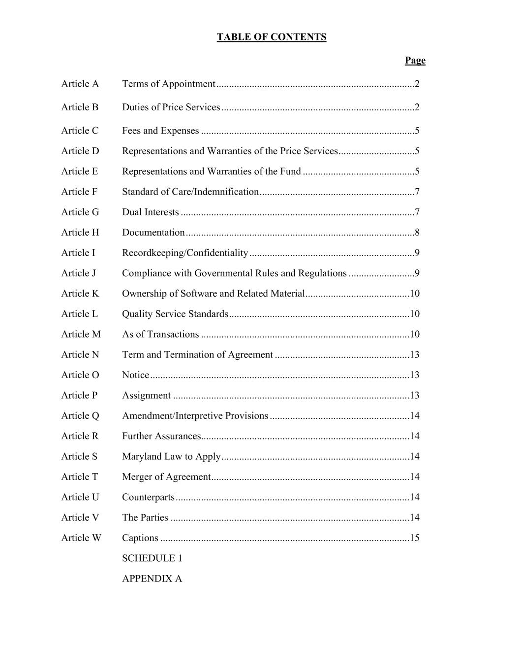 TABLE OF CONTENTS Page Article A Terms of Appointment ..............................................................................2 Article B Duties of Price Services ............................................................................2 Article C Fees and Expenses ....................................................................................5 Article D Representations and Warranties of the Price Services ..............................5 Article E Representations and Warranties of the Fund ............................................5 Article F Standard of Care/Indemnification .............................................................7 Article G Dual Interests ............................................................................................7 Article H Documentation ..........................................................................................8 Article I Recordkeeping/Confidentiality .................................................................9 Article J Compliance with Governmental Rules and Regulations ..........................9 Article K Ownership of Software and Related Material .........................................10 Article L Quality Service Standards .......................................................................10 Article M As of Transactions ..................................................................................10 Article N Term and Termination of Agreement .....................................................13 Article O Notice ......................................................................................................13 Article P Assignment .............................................................................................13 Article Q Amendment/Interpretive Provisions .......................................................14 Article R Further Assurances..................................................................................14 Article S Maryland Law to Apply ..........................................................................14 Article T Merger of Agreement ..............................................................................14 Article U Counterparts ............................................................................................14 Article V The Parties ..............................................................................................14 Article W Captions ..................................................................................................15 SCHEDULE 1 APPENDIX A