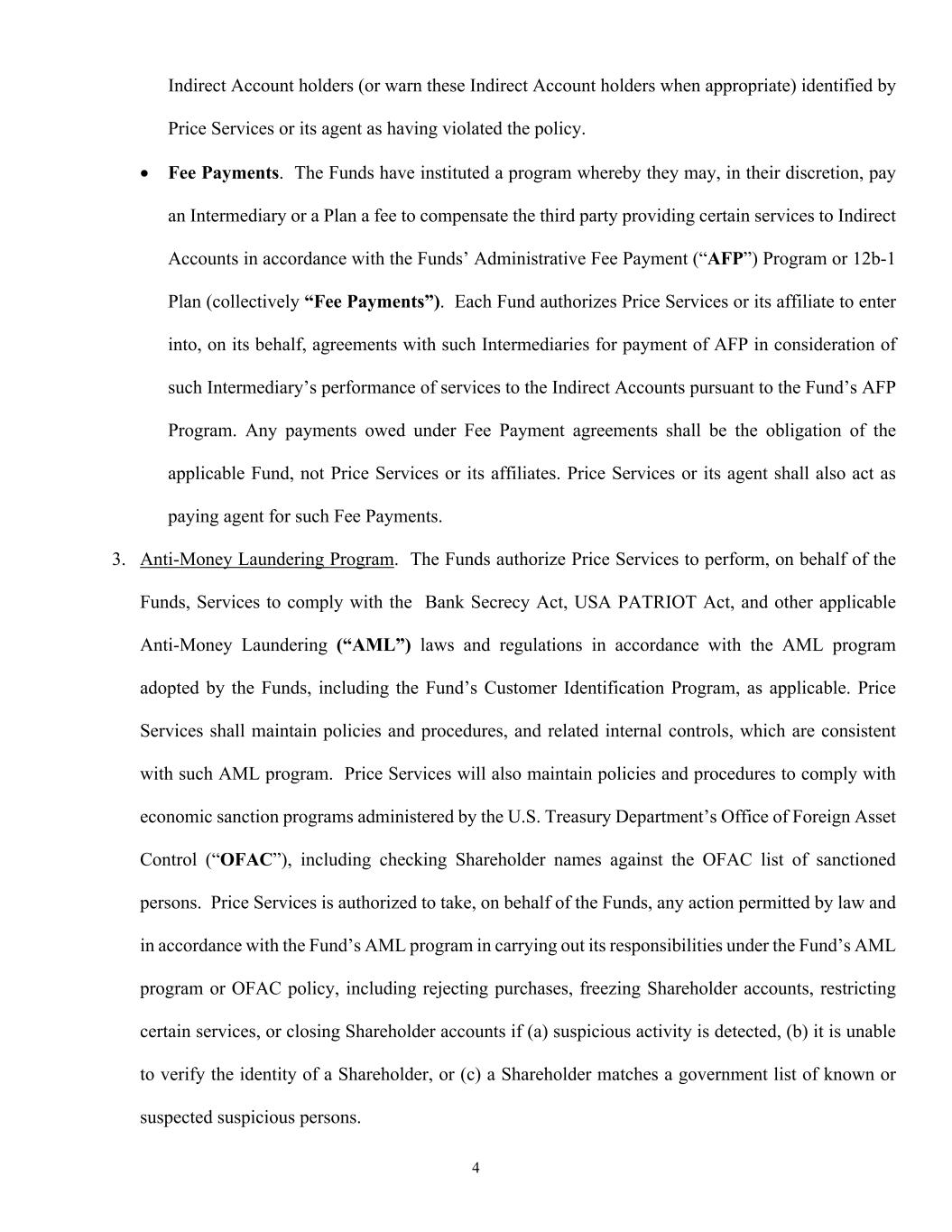 4 Indirect Account holders (or warn these Indirect Account holders when appropriate) identified by Price Services or its agent as having violated the policy. • Fee Payments. The Funds have instituted a program whereby they may, in their discretion, pay an Intermediary or a Plan a fee to compensate the third party providing certain services to Indirect Accounts in accordance with the Funds’ Administrative Fee Payment (“AFP”) Program or 12b-1 Plan (collectively “Fee Payments”). Each Fund authorizes Price Services or its affiliate to enter into, on its behalf, agreements with such Intermediaries for payment of AFP in consideration of such Intermediary’s performance of services to the Indirect Accounts pursuant to the Fund’s AFP Program. Any payments owed under Fee Payment agreements shall be the obligation of the applicable Fund, not Price Services or its affiliates. Price Services or its agent shall also act as paying agent for such Fee Payments. 3. Anti-Money Laundering Program. The Funds authorize Price Services to perform, on behalf of the Funds, Services to comply with the Bank Secrecy Act, USA PATRIOT Act, and other applicable Anti-Money Laundering (“AML”) laws and regulations in accordance with the AML program adopted by the Funds, including the Fund’s Customer Identification Program, as applicable. Price Services shall maintain policies and procedures, and related internal controls, which are consistent with such AML program. Price Services will also maintain policies and procedures to comply with economic sanction programs administered by the U.S. Treasury Department’s Office of Foreign Asset Control (“OFAC”), including checking Shareholder names against the OFAC list of sanctioned persons. Price Services is authorized to take, on behalf of the Funds, any action permitted by law and in accordance with the Fund’s AML program in carrying out its responsibilities under the Fund’s AML program or OFAC policy, including rejecting purchases, freezing Shareholder accounts, restricting certain services, or closing Shareholder accounts if (a) suspicious activity is detected, (b) it is unable to verify the identity of a Shareholder, or (c) a Shareholder matches a government list of known or suspected suspicious persons.