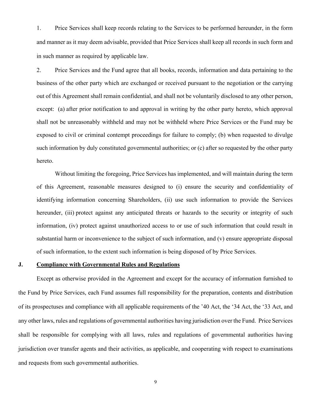 9 1. Price Services shall keep records relating to the Services to be performed hereunder, in the form and manner as it may deem advisable, provided that Price Services shall keep all records in such form and in such manner as required by applicable law. 2. Price Services and the Fund agree that all books, records, information and data pertaining to the business of the other party which are exchanged or received pursuant to the negotiation or the carrying out of this Agreement shall remain confidential, and shall not be voluntarily disclosed to any other person, except: (a) after prior notification to and approval in writing by the other party hereto, which approval shall not be unreasonably withheld and may not be withheld where Price Services or the Fund may be exposed to civil or criminal contempt proceedings for failure to comply; (b) when requested to divulge such information by duly constituted governmental authorities; or (c) after so requested by the other party hereto. Without limiting the foregoing, Price Services has implemented, and will maintain during the term of this Agreement, reasonable measures designed to (i) ensure the security and confidentiality of identifying information concerning Shareholders, (ii) use such information to provide the Services hereunder, (iii) protect against any anticipated threats or hazards to the security or integrity of such information, (iv) protect against unauthorized access to or use of such information that could result in substantial harm or inconvenience to the subject of such information, and (v) ensure appropriate disposal of such information, to the extent such information is being disposed of by Price Services. J. Compliance with Governmental Rules and Regulations Except as otherwise provided in the Agreement and except for the accuracy of information furnished to the Fund by Price Services, each Fund assumes full responsibility for the preparation, contents and distribution of its prospectuses and compliance with all applicable requirements of the ’40 Act, the ‘34 Act, the ‘33 Act, and any other laws, rules and regulations of governmental authorities having jurisdiction over the Fund. Price Services shall be responsible for complying with all laws, rules and regulations of governmental authorities having jurisdiction over transfer agents and their activities, as applicable, and cooperating with respect to examinations and requests from such governmental authorities.