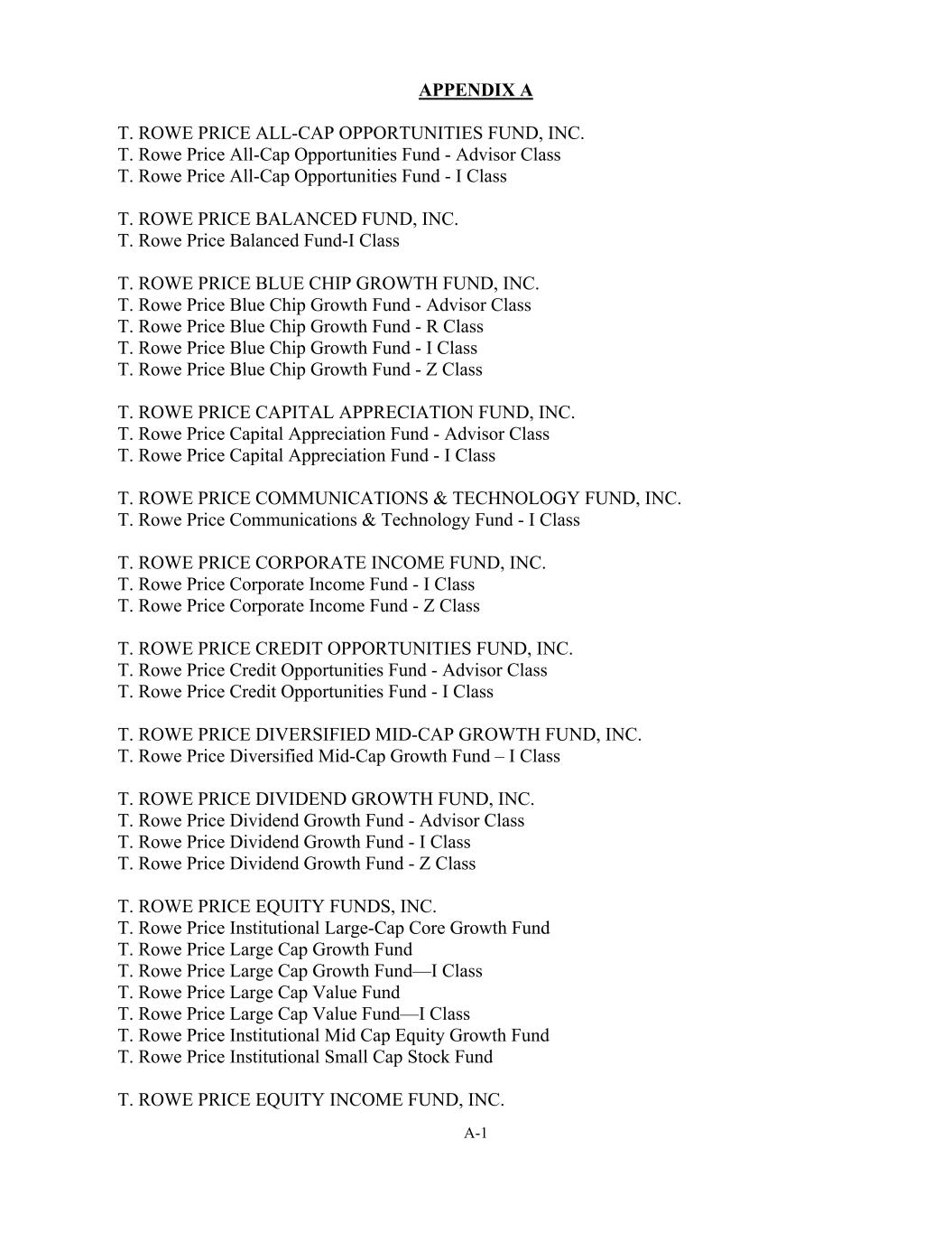 A-1 APPENDIX A T. ROWE PRICE ALL-CAP OPPORTUNITIES FUND, INC. T. Rowe Price All-Cap Opportunities Fund - Advisor Class T. Rowe Price All-Cap Opportunities Fund - I Class T. ROWE PRICE BALANCED FUND, INC. T. Rowe Price Balanced Fund-I Class T. ROWE PRICE BLUE CHIP GROWTH FUND, INC. T. Rowe Price Blue Chip Growth Fund - Advisor Class T. Rowe Price Blue Chip Growth Fund - R Class T. Rowe Price Blue Chip Growth Fund - I Class T. Rowe Price Blue Chip Growth Fund - Z Class T. ROWE PRICE CAPITAL APPRECIATION FUND, INC. T. Rowe Price Capital Appreciation Fund - Advisor Class T. Rowe Price Capital Appreciation Fund - I Class T. ROWE PRICE COMMUNICATIONS & TECHNOLOGY FUND, INC. T. Rowe Price Communications & Technology Fund - I Class T. ROWE PRICE CORPORATE INCOME FUND, INC. T. Rowe Price Corporate Income Fund - I Class T. Rowe Price Corporate Income Fund - Z Class T. ROWE PRICE CREDIT OPPORTUNITIES FUND, INC. T. Rowe Price Credit Opportunities Fund - Advisor Class T. Rowe Price Credit Opportunities Fund - I Class T. ROWE PRICE DIVERSIFIED MID-CAP GROWTH FUND, INC. T. Rowe Price Diversified Mid-Cap Growth Fund – I Class T. ROWE PRICE DIVIDEND GROWTH FUND, INC. T. Rowe Price Dividend Growth Fund - Advisor Class T. Rowe Price Dividend Growth Fund - I Class T. Rowe Price Dividend Growth Fund - Z Class T. ROWE PRICE EQUITY FUNDS, INC. T. Rowe Price Institutional Large-Cap Core Growth Fund T. Rowe Price Large Cap Growth Fund T. Rowe Price Large Cap Growth Fund—I Class T. Rowe Price Large Cap Value Fund T. Rowe Price Large Cap Value Fund—I Class T. Rowe Price Institutional Mid Cap Equity Growth Fund T. Rowe Price Institutional Small Cap Stock Fund T. ROWE PRICE EQUITY INCOME FUND, INC.