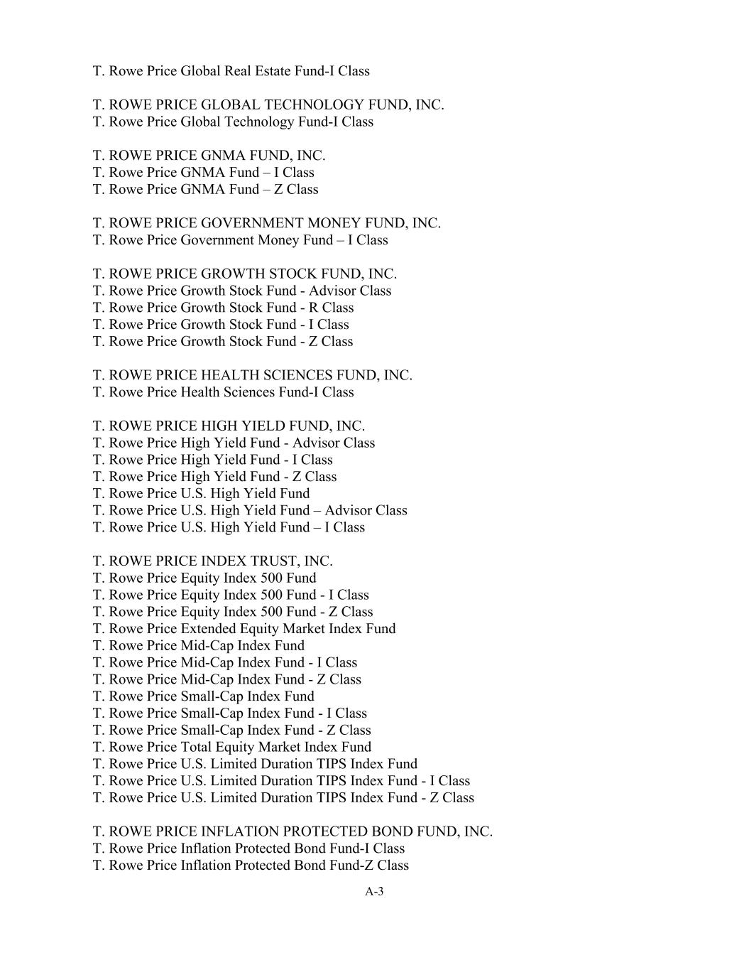 A-3 T. Rowe Price Global Real Estate Fund-I Class T. ROWE PRICE GLOBAL TECHNOLOGY FUND, INC. T. Rowe Price Global Technology Fund-I Class T. ROWE PRICE GNMA FUND, INC. T. Rowe Price GNMA Fund – I Class T. Rowe Price GNMA Fund – Z Class T. ROWE PRICE GOVERNMENT MONEY FUND, INC. T. Rowe Price Government Money Fund – I Class T. ROWE PRICE GROWTH STOCK FUND, INC. T. Rowe Price Growth Stock Fund - Advisor Class T. Rowe Price Growth Stock Fund - R Class T. Rowe Price Growth Stock Fund - I Class T. Rowe Price Growth Stock Fund - Z Class T. ROWE PRICE HEALTH SCIENCES FUND, INC. T. Rowe Price Health Sciences Fund-I Class T. ROWE PRICE HIGH YIELD FUND, INC. T. Rowe Price High Yield Fund - Advisor Class T. Rowe Price High Yield Fund - I Class T. Rowe Price High Yield Fund - Z Class T. Rowe Price U.S. High Yield Fund T. Rowe Price U.S. High Yield Fund – Advisor Class T. Rowe Price U.S. High Yield Fund – I Class T. ROWE PRICE INDEX TRUST, INC. T. Rowe Price Equity Index 500 Fund T. Rowe Price Equity Index 500 Fund - I Class T. Rowe Price Equity Index 500 Fund - Z Class T. Rowe Price Extended Equity Market Index Fund T. Rowe Price Mid-Cap Index Fund T. Rowe Price Mid-Cap Index Fund - I Class T. Rowe Price Mid-Cap Index Fund - Z Class T. Rowe Price Small-Cap Index Fund T. Rowe Price Small-Cap Index Fund - I Class T. Rowe Price Small-Cap Index Fund - Z Class T. Rowe Price Total Equity Market Index Fund T. Rowe Price U.S. Limited Duration TIPS Index Fund T. Rowe Price U.S. Limited Duration TIPS Index Fund - I Class T. Rowe Price U.S. Limited Duration TIPS Index Fund - Z Class T. ROWE PRICE INFLATION PROTECTED BOND FUND, INC. T. Rowe Price Inflation Protected Bond Fund-I Class T. Rowe Price Inflation Protected Bond Fund-Z Class