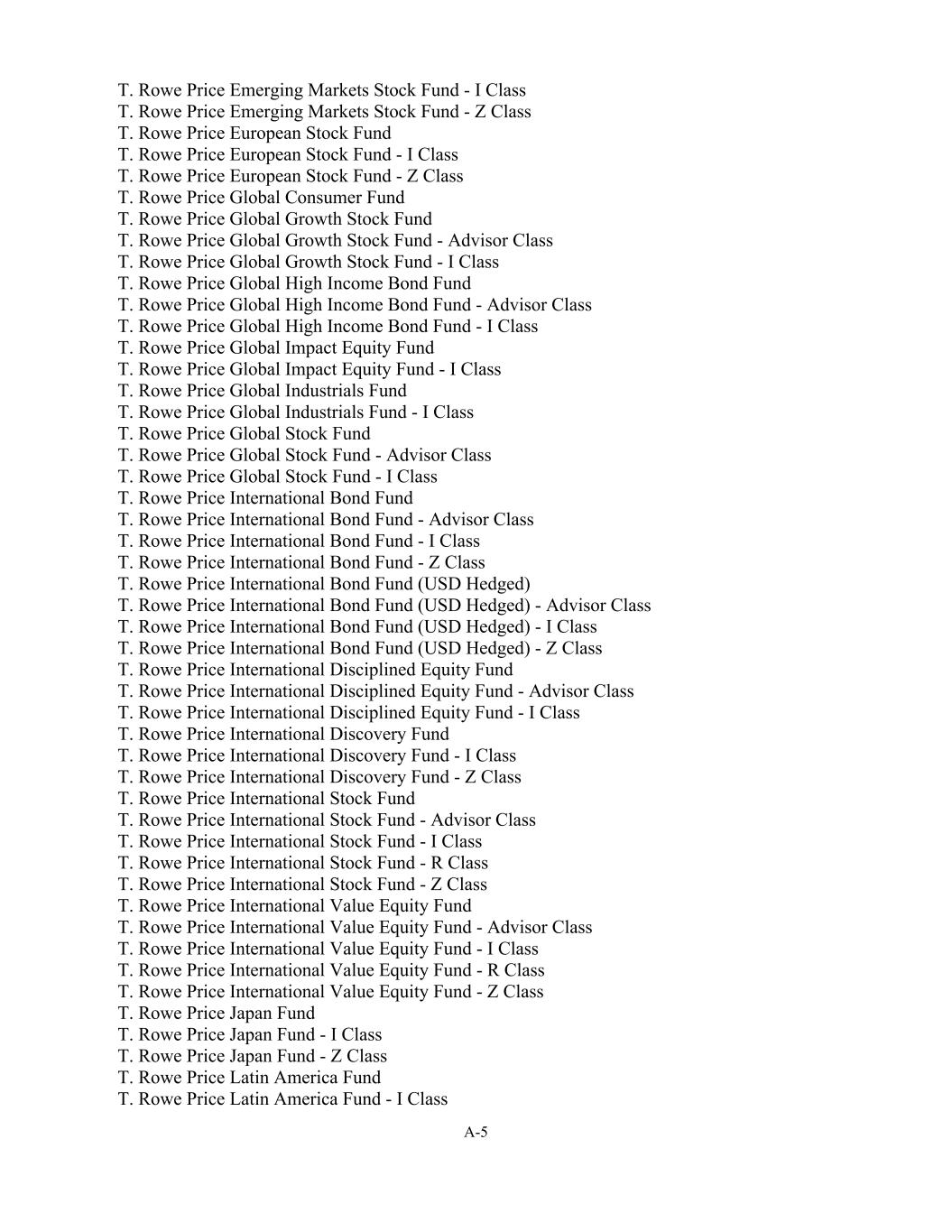 A-5 T. Rowe Price Emerging Markets Stock Fund - I Class T. Rowe Price Emerging Markets Stock Fund - Z Class T. Rowe Price European Stock Fund T. Rowe Price European Stock Fund - I Class T. Rowe Price European Stock Fund - Z Class T. Rowe Price Global Consumer Fund T. Rowe Price Global Growth Stock Fund T. Rowe Price Global Growth Stock Fund - Advisor Class T. Rowe Price Global Growth Stock Fund - I Class T. Rowe Price Global High Income Bond Fund T. Rowe Price Global High Income Bond Fund - Advisor Class T. Rowe Price Global High Income Bond Fund - I Class T. Rowe Price Global Impact Equity Fund T. Rowe Price Global Impact Equity Fund - I Class T. Rowe Price Global Industrials Fund T. Rowe Price Global Industrials Fund - I Class T. Rowe Price Global Stock Fund T. Rowe Price Global Stock Fund - Advisor Class T. Rowe Price Global Stock Fund - I Class T. Rowe Price International Bond Fund T. Rowe Price International Bond Fund - Advisor Class T. Rowe Price International Bond Fund - I Class T. Rowe Price International Bond Fund - Z Class T. Rowe Price International Bond Fund (USD Hedged) T. Rowe Price International Bond Fund (USD Hedged) - Advisor Class T. Rowe Price International Bond Fund (USD Hedged) - I Class T. Rowe Price International Bond Fund (USD Hedged) - Z Class T. Rowe Price International Disciplined Equity Fund T. Rowe Price International Disciplined Equity Fund - Advisor Class T. Rowe Price International Disciplined Equity Fund - I Class T. Rowe Price International Discovery Fund T. Rowe Price International Discovery Fund - I Class T. Rowe Price International Discovery Fund - Z Class T. Rowe Price International Stock Fund T. Rowe Price International Stock Fund - Advisor Class T. Rowe Price International Stock Fund - I Class T. Rowe Price International Stock Fund - R Class T. Rowe Price International Stock Fund - Z Class T. Rowe Price International Value Equity Fund T. Rowe Price International Value Equity Fund - Advisor Class T. Rowe Price International Value Equity Fund - I Class T. Rowe Price International Value Equity Fund - R Class T. Rowe Price International Value Equity Fund - Z Class T. Rowe Price Japan Fund T. Rowe Price Japan Fund - I Class T. Rowe Price Japan Fund - Z Class T. Rowe Price Latin America Fund T. Rowe Price Latin America Fund - I Class