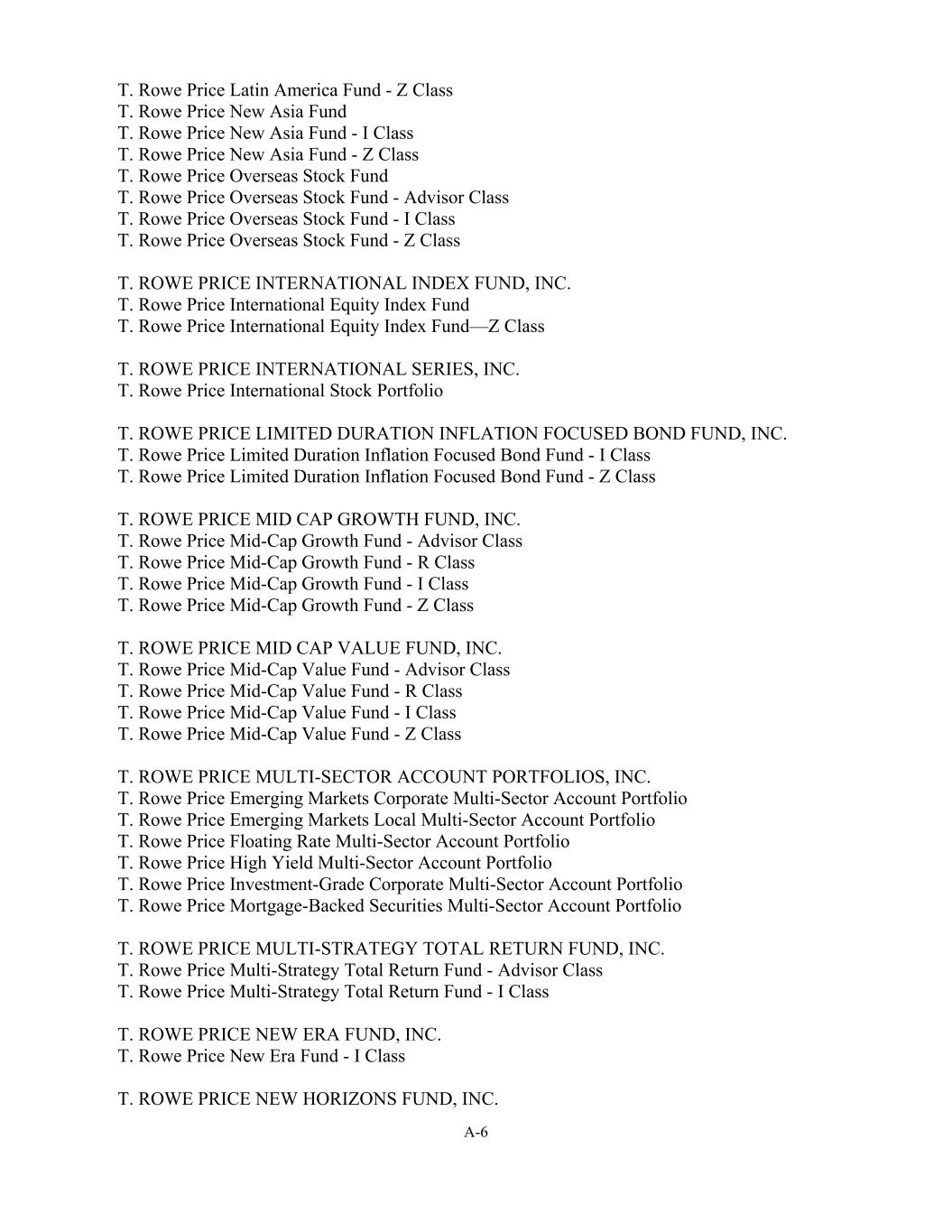 A-6 T. Rowe Price Latin America Fund - Z Class T. Rowe Price New Asia Fund T. Rowe Price New Asia Fund - I Class T. Rowe Price New Asia Fund - Z Class T. Rowe Price Overseas Stock Fund T. Rowe Price Overseas Stock Fund - Advisor Class T. Rowe Price Overseas Stock Fund - I Class T. Rowe Price Overseas Stock Fund - Z Class T. ROWE PRICE INTERNATIONAL INDEX FUND, INC. T. Rowe Price International Equity Index Fund T. Rowe Price International Equity Index Fund—Z Class T. ROWE PRICE INTERNATIONAL SERIES, INC. T. Rowe Price International Stock Portfolio T. ROWE PRICE LIMITED DURATION INFLATION FOCUSED BOND FUND, INC. T. Rowe Price Limited Duration Inflation Focused Bond Fund - I Class T. Rowe Price Limited Duration Inflation Focused Bond Fund - Z Class T. ROWE PRICE MID CAP GROWTH FUND, INC. T. Rowe Price Mid-Cap Growth Fund - Advisor Class T. Rowe Price Mid-Cap Growth Fund - R Class T. Rowe Price Mid-Cap Growth Fund - I Class T. Rowe Price Mid-Cap Growth Fund - Z Class T. ROWE PRICE MID CAP VALUE FUND, INC. T. Rowe Price Mid-Cap Value Fund - Advisor Class T. Rowe Price Mid-Cap Value Fund - R Class T. Rowe Price Mid-Cap Value Fund - I Class T. Rowe Price Mid-Cap Value Fund - Z Class T. ROWE PRICE MULTI-SECTOR ACCOUNT PORTFOLIOS, INC. T. Rowe Price Emerging Markets Corporate Multi-Sector Account Portfolio T. Rowe Price Emerging Markets Local Multi-Sector Account Portfolio T. Rowe Price Floating Rate Multi-Sector Account Portfolio T. Rowe Price High Yield Multi-Sector Account Portfolio T. Rowe Price Investment-Grade Corporate Multi-Sector Account Portfolio T. Rowe Price Mortgage-Backed Securities Multi-Sector Account Portfolio T. ROWE PRICE MULTI-STRATEGY TOTAL RETURN FUND, INC. T. Rowe Price Multi-Strategy Total Return Fund - Advisor Class T. Rowe Price Multi-Strategy Total Return Fund - I Class T. ROWE PRICE NEW ERA FUND, INC. T. Rowe Price New Era Fund - I Class T. ROWE PRICE NEW HORIZONS FUND, INC.
