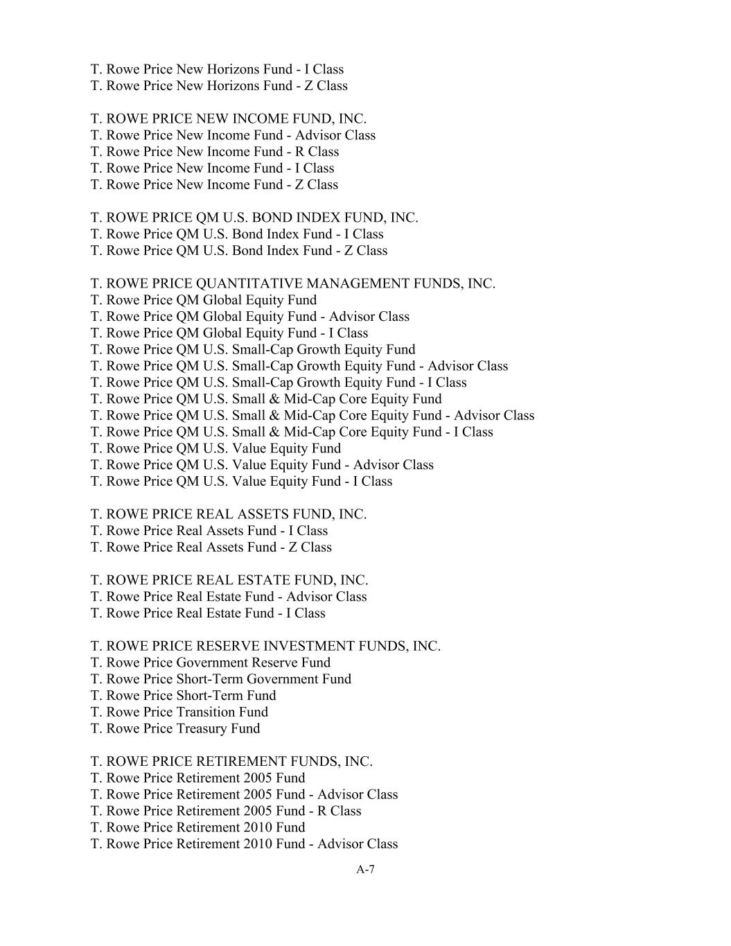 A-7 T. Rowe Price New Horizons Fund - I Class T. Rowe Price New Horizons Fund - Z Class T. ROWE PRICE NEW INCOME FUND, INC. T. Rowe Price New Income Fund - Advisor Class T. Rowe Price New Income Fund - R Class T. Rowe Price New Income Fund - I Class T. Rowe Price New Income Fund - Z Class T. ROWE PRICE QM U.S. BOND INDEX FUND, INC. T. Rowe Price QM U.S. Bond Index Fund - I Class T. Rowe Price QM U.S. Bond Index Fund - Z Class T. ROWE PRICE QUANTITATIVE MANAGEMENT FUNDS, INC. T. Rowe Price QM Global Equity Fund T. Rowe Price QM Global Equity Fund - Advisor Class T. Rowe Price QM Global Equity Fund - I Class T. Rowe Price QM U.S. Small-Cap Growth Equity Fund T. Rowe Price QM U.S. Small-Cap Growth Equity Fund - Advisor Class T. Rowe Price QM U.S. Small-Cap Growth Equity Fund - I Class T. Rowe Price QM U.S. Small & Mid-Cap Core Equity Fund T. Rowe Price QM U.S. Small & Mid-Cap Core Equity Fund - Advisor Class T. Rowe Price QM U.S. Small & Mid-Cap Core Equity Fund - I Class T. Rowe Price QM U.S. Value Equity Fund T. Rowe Price QM U.S. Value Equity Fund - Advisor Class T. Rowe Price QM U.S. Value Equity Fund - I Class T. ROWE PRICE REAL ASSETS FUND, INC. T. Rowe Price Real Assets Fund - I Class T. Rowe Price Real Assets Fund - Z Class T. ROWE PRICE REAL ESTATE FUND, INC. T. Rowe Price Real Estate Fund - Advisor Class T. Rowe Price Real Estate Fund - I Class T. ROWE PRICE RESERVE INVESTMENT FUNDS, INC. T. Rowe Price Government Reserve Fund T. Rowe Price Short-Term Government Fund T. Rowe Price Short-Term Fund T. Rowe Price Transition Fund T. Rowe Price Treasury Fund T. ROWE PRICE RETIREMENT FUNDS, INC. T. Rowe Price Retirement 2005 Fund T. Rowe Price Retirement 2005 Fund - Advisor Class T. Rowe Price Retirement 2005 Fund - R Class T. Rowe Price Retirement 2010 Fund T. Rowe Price Retirement 2010 Fund - Advisor Class