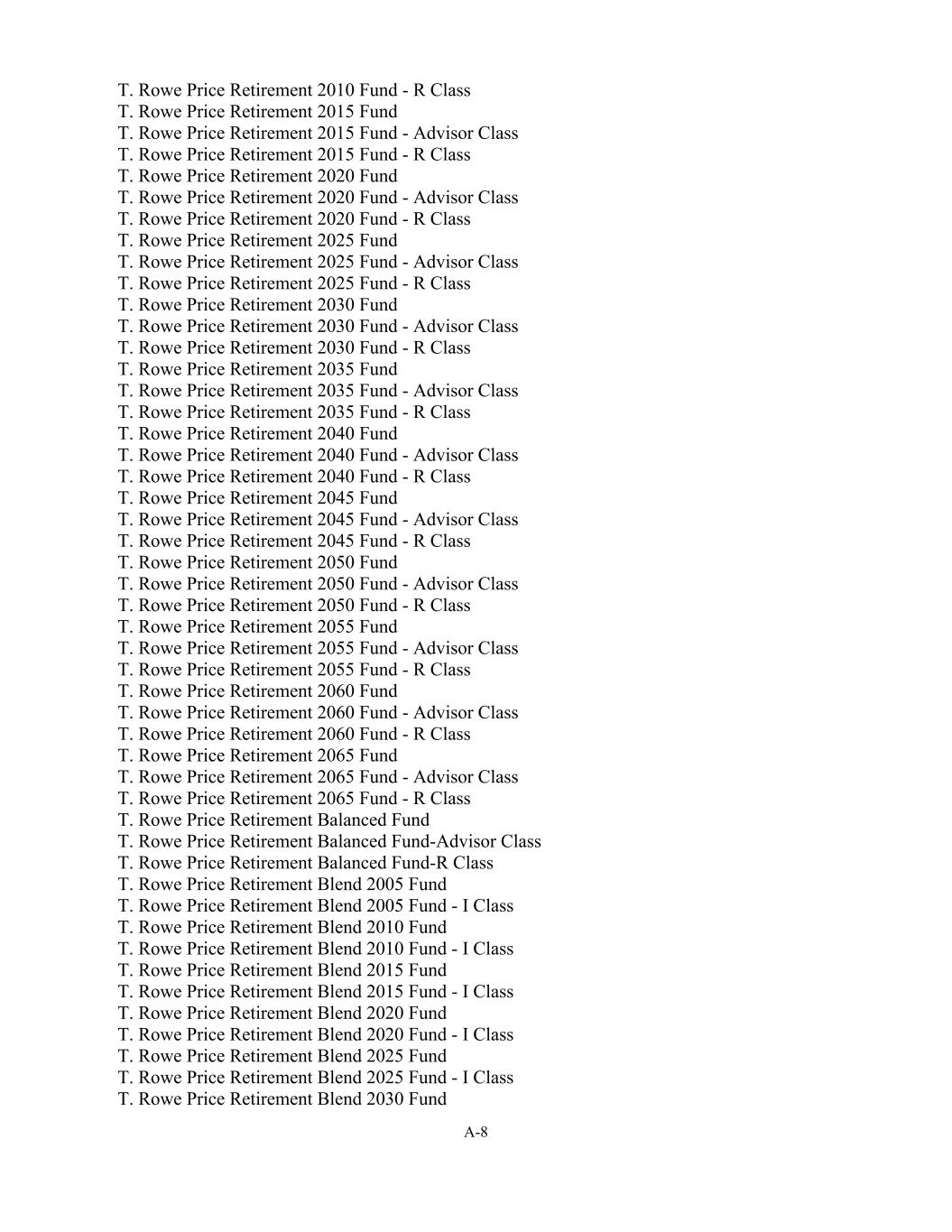 A-8 T. Rowe Price Retirement 2010 Fund - R Class T. Rowe Price Retirement 2015 Fund T. Rowe Price Retirement 2015 Fund - Advisor Class T. Rowe Price Retirement 2015 Fund - R Class T. Rowe Price Retirement 2020 Fund T. Rowe Price Retirement 2020 Fund - Advisor Class T. Rowe Price Retirement 2020 Fund - R Class T. Rowe Price Retirement 2025 Fund T. Rowe Price Retirement 2025 Fund - Advisor Class T. Rowe Price Retirement 2025 Fund - R Class T. Rowe Price Retirement 2030 Fund T. Rowe Price Retirement 2030 Fund - Advisor Class T. Rowe Price Retirement 2030 Fund - R Class T. Rowe Price Retirement 2035 Fund T. Rowe Price Retirement 2035 Fund - Advisor Class T. Rowe Price Retirement 2035 Fund - R Class T. Rowe Price Retirement 2040 Fund T. Rowe Price Retirement 2040 Fund - Advisor Class T. Rowe Price Retirement 2040 Fund - R Class T. Rowe Price Retirement 2045 Fund T. Rowe Price Retirement 2045 Fund - Advisor Class T. Rowe Price Retirement 2045 Fund - R Class T. Rowe Price Retirement 2050 Fund T. Rowe Price Retirement 2050 Fund - Advisor Class T. Rowe Price Retirement 2050 Fund - R Class T. Rowe Price Retirement 2055 Fund T. Rowe Price Retirement 2055 Fund - Advisor Class T. Rowe Price Retirement 2055 Fund - R Class T. Rowe Price Retirement 2060 Fund T. Rowe Price Retirement 2060 Fund - Advisor Class T. Rowe Price Retirement 2060 Fund - R Class T. Rowe Price Retirement 2065 Fund T. Rowe Price Retirement 2065 Fund - Advisor Class T. Rowe Price Retirement 2065 Fund - R Class T. Rowe Price Retirement Balanced Fund T. Rowe Price Retirement Balanced Fund-Advisor Class T. Rowe Price Retirement Balanced Fund-R Class T. Rowe Price Retirement Blend 2005 Fund T. Rowe Price Retirement Blend 2005 Fund - I Class T. Rowe Price Retirement Blend 2010 Fund T. Rowe Price Retirement Blend 2010 Fund - I Class T. Rowe Price Retirement Blend 2015 Fund T. Rowe Price Retirement Blend 2015 Fund - I Class T. Rowe Price Retirement Blend 2020 Fund T. Rowe Price Retirement Blend 2020 Fund - I Class T. Rowe Price Retirement Blend 2025 Fund T. Rowe Price Retirement Blend 2025 Fund - I Class T. Rowe Price Retirement Blend 2030 Fund