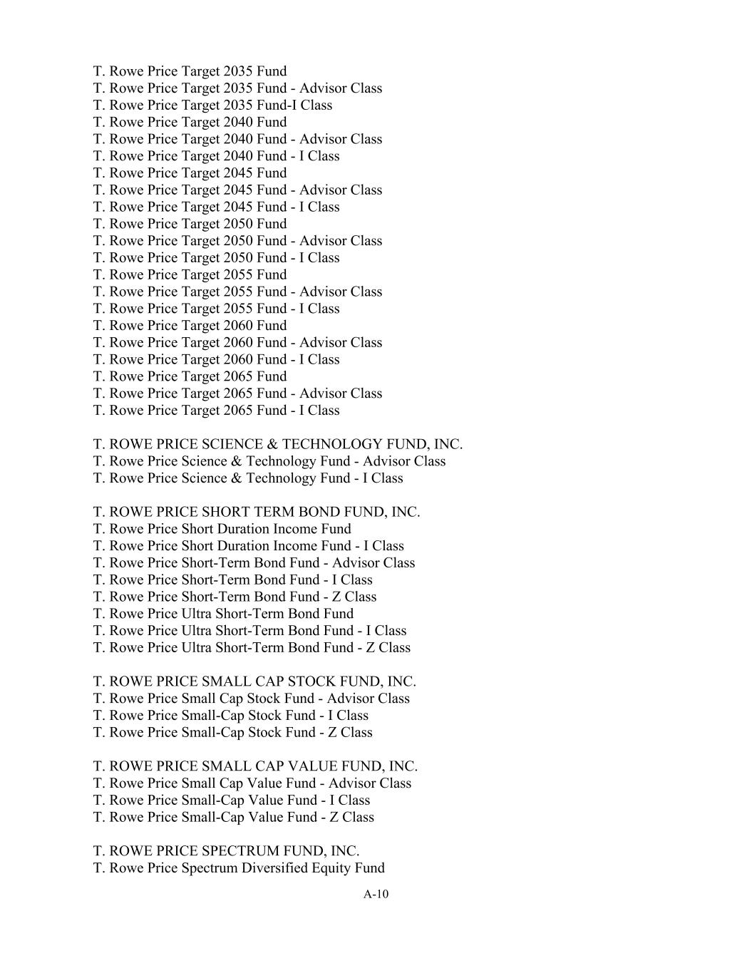 A-10 T. Rowe Price Target 2035 Fund T. Rowe Price Target 2035 Fund - Advisor Class T. Rowe Price Target 2035 Fund-I Class T. Rowe Price Target 2040 Fund T. Rowe Price Target 2040 Fund - Advisor Class T. Rowe Price Target 2040 Fund - I Class T. Rowe Price Target 2045 Fund T. Rowe Price Target 2045 Fund - Advisor Class T. Rowe Price Target 2045 Fund - I Class T. Rowe Price Target 2050 Fund T. Rowe Price Target 2050 Fund - Advisor Class T. Rowe Price Target 2050 Fund - I Class T. Rowe Price Target 2055 Fund T. Rowe Price Target 2055 Fund - Advisor Class T. Rowe Price Target 2055 Fund - I Class T. Rowe Price Target 2060 Fund T. Rowe Price Target 2060 Fund - Advisor Class T. Rowe Price Target 2060 Fund - I Class T. Rowe Price Target 2065 Fund T. Rowe Price Target 2065 Fund - Advisor Class T. Rowe Price Target 2065 Fund - I Class T. ROWE PRICE SCIENCE & TECHNOLOGY FUND, INC. T. Rowe Price Science & Technology Fund - Advisor Class T. Rowe Price Science & Technology Fund - I Class T. ROWE PRICE SHORT TERM BOND FUND, INC. T. Rowe Price Short Duration Income Fund T. Rowe Price Short Duration Income Fund - I Class T. Rowe Price Short-Term Bond Fund - Advisor Class T. Rowe Price Short-Term Bond Fund - I Class T. Rowe Price Short-Term Bond Fund - Z Class T. Rowe Price Ultra Short-Term Bond Fund T. Rowe Price Ultra Short-Term Bond Fund - I Class T. Rowe Price Ultra Short-Term Bond Fund - Z Class T. ROWE PRICE SMALL CAP STOCK FUND, INC. T. Rowe Price Small Cap Stock Fund - Advisor Class T. Rowe Price Small-Cap Stock Fund - I Class T. Rowe Price Small-Cap Stock Fund - Z Class T. ROWE PRICE SMALL CAP VALUE FUND, INC. T. Rowe Price Small Cap Value Fund - Advisor Class T. Rowe Price Small-Cap Value Fund - I Class T. Rowe Price Small-Cap Value Fund - Z Class T. ROWE PRICE SPECTRUM FUND, INC. T. Rowe Price Spectrum Diversified Equity Fund