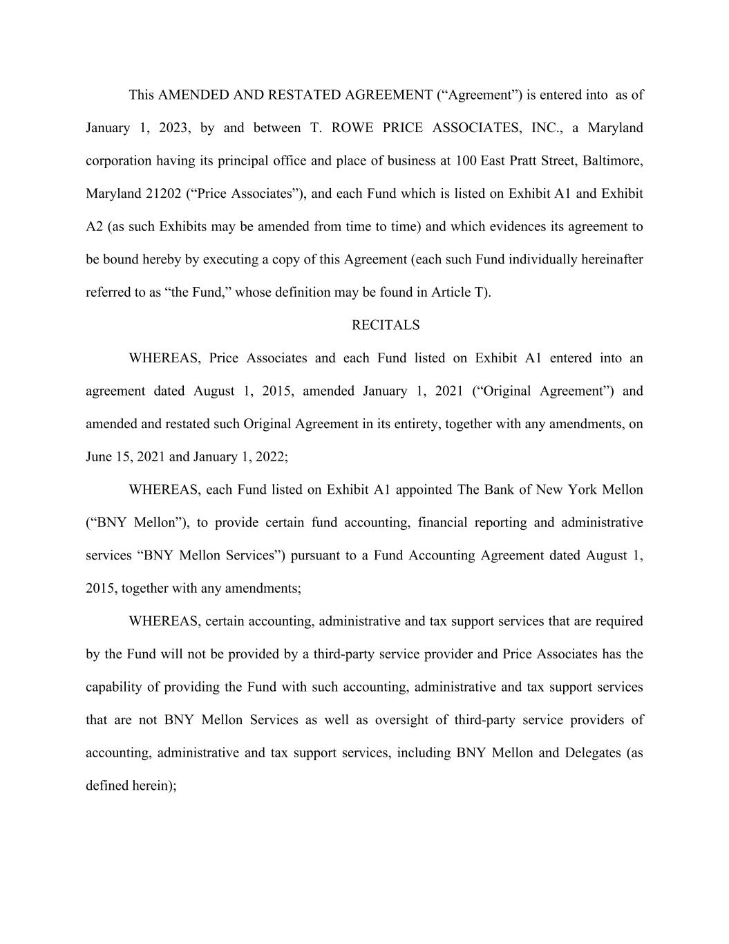 This AMENDED AND RESTATED AGREEMENT (“Agreement”) is entered into as of January 1, 2023, by and between T. ROWE PRICE ASSOCIATES, INC., a Maryland corporation having its principal office and place of business at 100 East Pratt Street, Baltimore, Maryland 21202 (“Price Associates”), and each Fund which is listed on Exhibit A1 and Exhibit A2 (as such Exhibits may be amended from time to time) and which evidences its agreement to be bound hereby by executing a copy of this Agreement (each such Fund individually hereinafter referred to as “the Fund,” whose definition may be found in Article T). RECITALS WHEREAS, Price Associates and each Fund listed on Exhibit A1 entered into an agreement dated August 1, 2015, amended January 1, 2021 (“Original Agreement”) and amended and restated such Original Agreement in its entirety, together with any amendments, on June 15, 2021 and January 1, 2022; WHEREAS, each Fund listed on Exhibit A1 appointed The Bank of New York Mellon (“BNY Mellon”), to provide certain fund accounting, financial reporting and administrative services “BNY Mellon Services”) pursuant to a Fund Accounting Agreement dated August 1, 2015, together with any amendments; WHEREAS, certain accounting, administrative and tax support services that are required by the Fund will not be provided by a third-party service provider and Price Associates has the capability of providing the Fund with such accounting, administrative and tax support services that are not BNY Mellon Services as well as oversight of third-party service providers of accounting, administrative and tax support services, including BNY Mellon and Delegates (as defined herein);