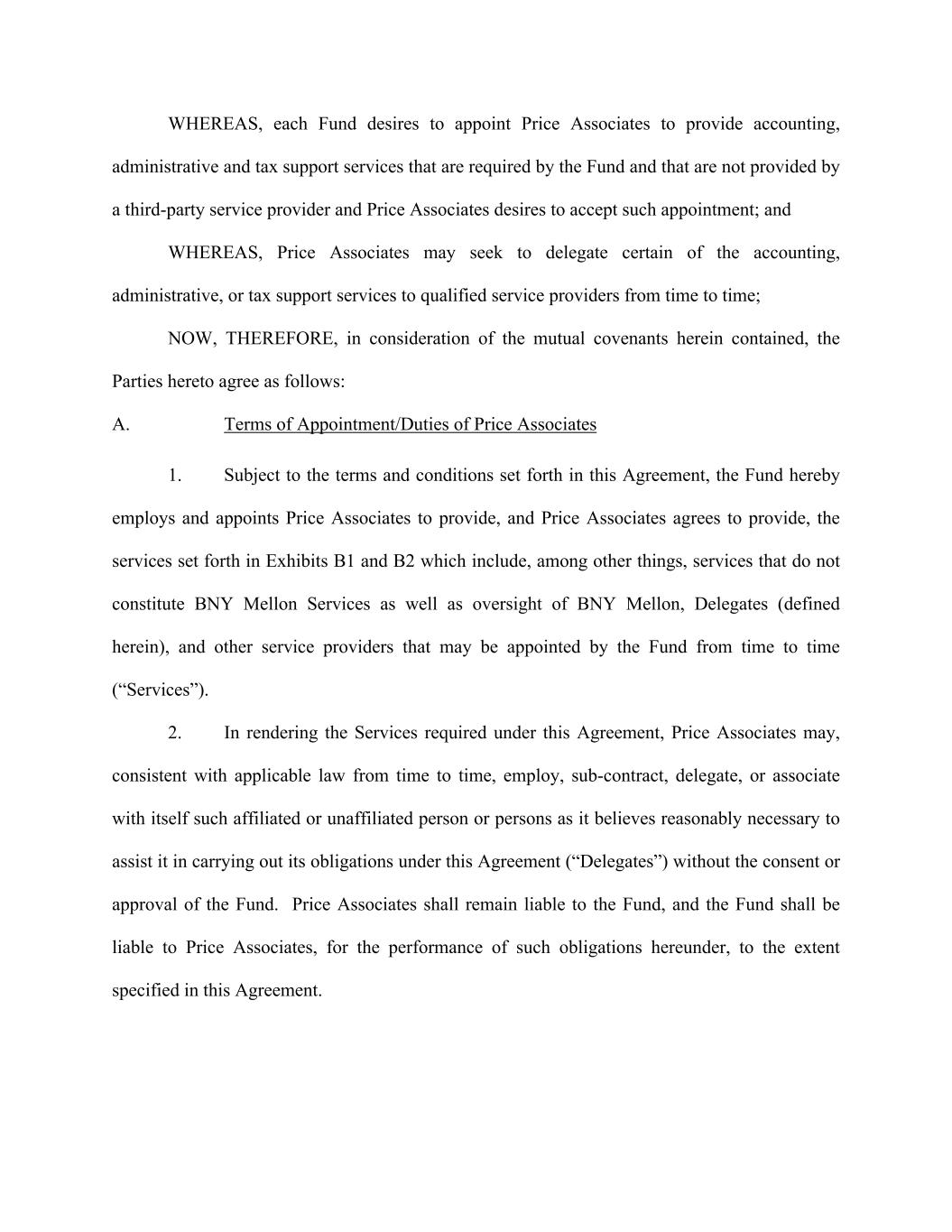 WHEREAS, each Fund desires to appoint Price Associates to provide accounting, administrative and tax support services that are required by the Fund and that are not provided by a third-party service provider and Price Associates desires to accept such appointment; and WHEREAS, Price Associates may seek to delegate certain of the accounting, administrative, or tax support services to qualified service providers from time to time; NOW, THEREFORE, in consideration of the mutual covenants herein contained, the Parties hereto agree as follows: A. Terms of Appointment/Duties of Price Associates 1. Subject to the terms and conditions set forth in this Agreement, the Fund hereby employs and appoints Price Associates to provide, and Price Associates agrees to provide, the services set forth in Exhibits B1 and B2 which include, among other things, services that do not constitute BNY Mellon Services as well as oversight of BNY Mellon, Delegates (defined herein), and other service providers that may be appointed by the Fund from time to time (“Services”). 2. In rendering the Services required under this Agreement, Price Associates may, consistent with applicable law from time to time, employ, sub-contract, delegate, or associate with itself such affiliated or unaffiliated person or persons as it believes reasonably necessary to assist it in carrying out its obligations under this Agreement (“Delegates”) without the consent or approval of the Fund. Price Associates shall remain liable to the Fund, and the Fund shall be liable to Price Associates, for the performance of such obligations hereunder, to the extent specified in this Agreement.