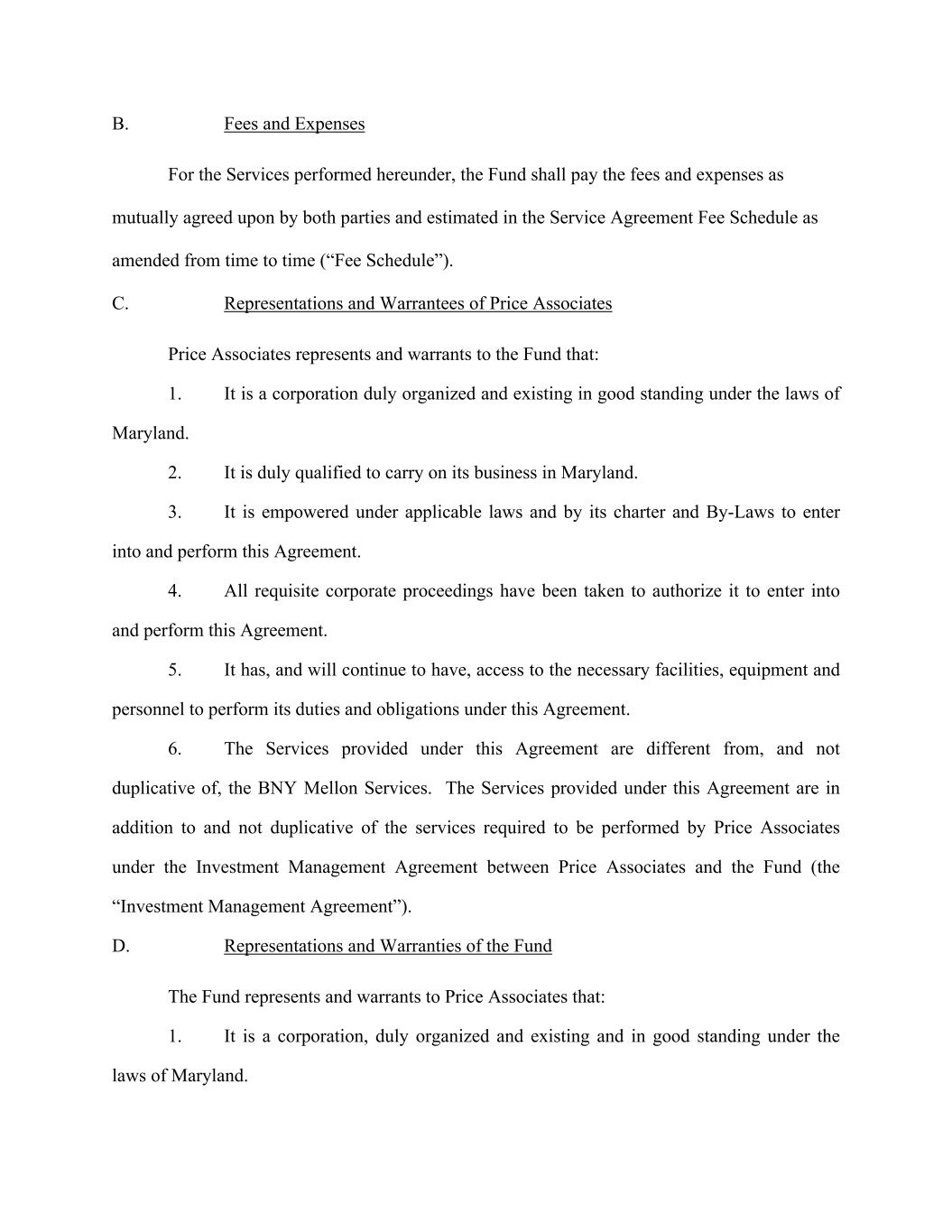B. Fees and Expenses For the Services performed hereunder, the Fund shall pay the fees and expenses as mutually agreed upon by both parties and estimated in the Service Agreement Fee Schedule as amended from time to time (“Fee Schedule”). C. Representations and Warrantees of Price Associates Price Associates represents and warrants to the Fund that: 1. It is a corporation duly organized and existing in good standing under the laws of Maryland. 2. It is duly qualified to carry on its business in Maryland. 3. It is empowered under applicable laws and by its charter and By-Laws to enter into and perform this Agreement. 4. All requisite corporate proceedings have been taken to authorize it to enter into and perform this Agreement. 5. It has, and will continue to have, access to the necessary facilities, equipment and personnel to perform its duties and obligations under this Agreement. 6. The Services provided under this Agreement are different from, and not duplicative of, the BNY Mellon Services. The Services provided under this Agreement are in addition to and not duplicative of the services required to be performed by Price Associates under the Investment Management Agreement between Price Associates and the Fund (the “Investment Management Agreement”). D. Representations and Warranties of the Fund The Fund represents and warrants to Price Associates that: 1. It is a corporation, duly organized and existing and in good standing under the laws of Maryland.