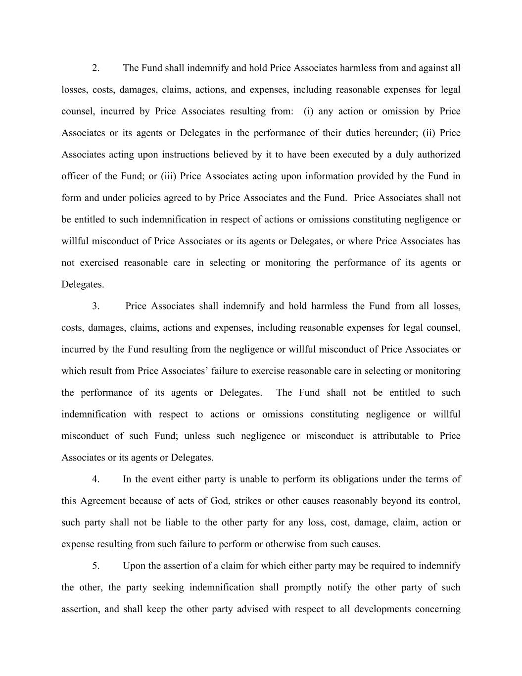 2. The Fund shall indemnify and hold Price Associates harmless from and against all losses, costs, damages, claims, actions, and expenses, including reasonable expenses for legal counsel, incurred by Price Associates resulting from: (i) any action or omission by Price Associates or its agents or Delegates in the performance of their duties hereunder; (ii) Price Associates acting upon instructions believed by it to have been executed by a duly authorized officer of the Fund; or (iii) Price Associates acting upon information provided by the Fund in form and under policies agreed to by Price Associates and the Fund. Price Associates shall not be entitled to such indemnification in respect of actions or omissions constituting negligence or willful misconduct of Price Associates or its agents or Delegates, or where Price Associates has not exercised reasonable care in selecting or monitoring the performance of its agents or Delegates. 3. Price Associates shall indemnify and hold harmless the Fund from all losses, costs, damages, claims, actions and expenses, including reasonable expenses for legal counsel, incurred by the Fund resulting from the negligence or willful misconduct of Price Associates or which result from Price Associates’ failure to exercise reasonable care in selecting or monitoring the performance of its agents or Delegates. The Fund shall not be entitled to such indemnification with respect to actions or omissions constituting negligence or willful misconduct of such Fund; unless such negligence or misconduct is attributable to Price Associates or its agents or Delegates. 4. In the event either party is unable to perform its obligations under the terms of this Agreement because of acts of God, strikes or other causes reasonably beyond its control, such party shall not be liable to the other party for any loss, cost, damage, claim, action or expense resulting from such failure to perform or otherwise from such causes. 5. Upon the assertion of a claim for which either party may be required to indemnify the other, the party seeking indemnification shall promptly notify the other party of such assertion, and shall keep the other party advised with respect to all developments concerning