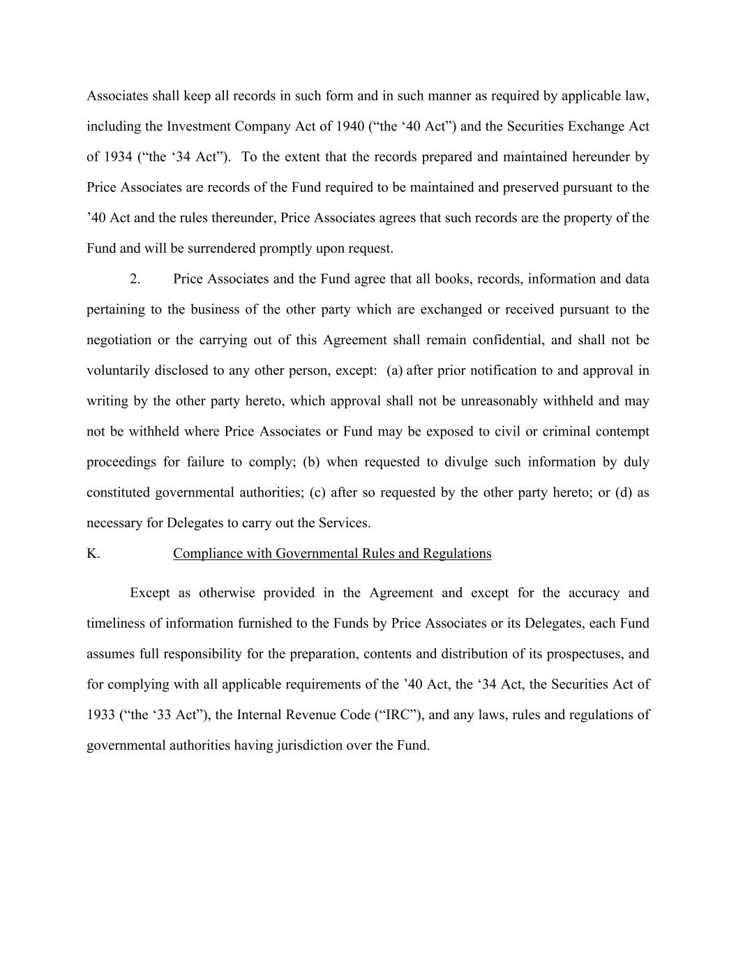 Associates shall keep all records in such form and in such manner as required by applicable law, including the Investment Company Act of 1940 (“the ‘40 Act”) and the Securities Exchange Act of 1934 (“the ‘34 Act”). To the extent that the records prepared and maintained hereunder by Price Associates are records of the Fund required to be maintained and preserved pursuant to the ’40 Act and the rules thereunder, Price Associates agrees that such records are the property of the Fund and will be surrendered promptly upon request. 2. Price Associates and the Fund agree that all books, records, information and data pertaining to the business of the other party which are exchanged or received pursuant to the negotiation or the carrying out of this Agreement shall remain confidential, and shall not be voluntarily disclosed to any other person, except: (a) after prior notification to and approval in writing by the other party hereto, which approval shall not be unreasonably withheld and may not be withheld where Price Associates or Fund may be exposed to civil or criminal contempt proceedings for failure to comply; (b) when requested to divulge such information by duly constituted governmental authorities; (c) after so requested by the other party hereto; or (d) as necessary for Delegates to carry out the Services. K. Compliance with Governmental Rules and Regulations Except as otherwise provided in the Agreement and except for the accuracy and timeliness of information furnished to the Funds by Price Associates or its Delegates, each Fund assumes full responsibility for the preparation, contents and distribution of its prospectuses, and for complying with all applicable requirements of the ’40 Act, the ‘34 Act, the Securities Act of 1933 (“the ‘33 Act”), the Internal Revenue Code (“IRC”), and any laws, rules and regulations of governmental authorities having jurisdiction over the Fund.