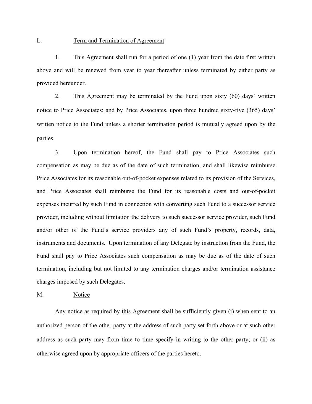 L. Term and Termination of Agreement 1. This Agreement shall run for a period of one (1) year from the date first written above and will be renewed from year to year thereafter unless terminated by either party as provided hereunder. 2. This Agreement may be terminated by the Fund upon sixty (60) days’ written notice to Price Associates; and by Price Associates, upon three hundred sixty-five (365) days’ written notice to the Fund unless a shorter termination period is mutually agreed upon by the parties. 3. Upon termination hereof, the Fund shall pay to Price Associates such compensation as may be due as of the date of such termination, and shall likewise reimburse Price Associates for its reasonable out-of-pocket expenses related to its provision of the Services, and Price Associates shall reimburse the Fund for its reasonable costs and out-of-pocket expenses incurred by such Fund in connection with converting such Fund to a successor service provider, including without limitation the delivery to such successor service provider, such Fund and/or other of the Fund’s service providers any of such Fund’s property, records, data, instruments and documents. Upon termination of any Delegate by instruction from the Fund, the Fund shall pay to Price Associates such compensation as may be due as of the date of such termination, including but not limited to any termination charges and/or termination assistance charges imposed by such Delegates. M. Notice Any notice as required by this Agreement shall be sufficiently given (i) when sent to an authorized person of the other party at the address of such party set forth above or at such other address as such party may from time to time specify in writing to the other party; or (ii) as otherwise agreed upon by appropriate officers of the parties hereto.