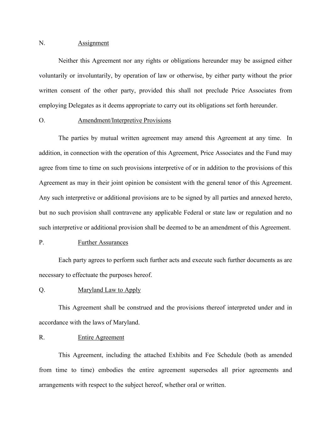 N. Assignment Neither this Agreement nor any rights or obligations hereunder may be assigned either voluntarily or involuntarily, by operation of law or otherwise, by either party without the prior written consent of the other party, provided this shall not preclude Price Associates from employing Delegates as it deems appropriate to carry out its obligations set forth hereunder. O. Amendment/Interpretive Provisions The parties by mutual written agreement may amend this Agreement at any time. In addition, in connection with the operation of this Agreement, Price Associates and the Fund may agree from time to time on such provisions interpretive of or in addition to the provisions of this Agreement as may in their joint opinion be consistent with the general tenor of this Agreement. Any such interpretive or additional provisions are to be signed by all parties and annexed hereto, but no such provision shall contravene any applicable Federal or state law or regulation and no such interpretive or additional provision shall be deemed to be an amendment of this Agreement. P. Further Assurances Each party agrees to perform such further acts and execute such further documents as are necessary to effectuate the purposes hereof. Q. Maryland Law to Apply This Agreement shall be construed and the provisions thereof interpreted under and in accordance with the laws of Maryland. R. Entire Agreement This Agreement, including the attached Exhibits and Fee Schedule (both as amended from time to time) embodies the entire agreement supersedes all prior agreements and arrangements with respect to the subject hereof, whether oral or written.