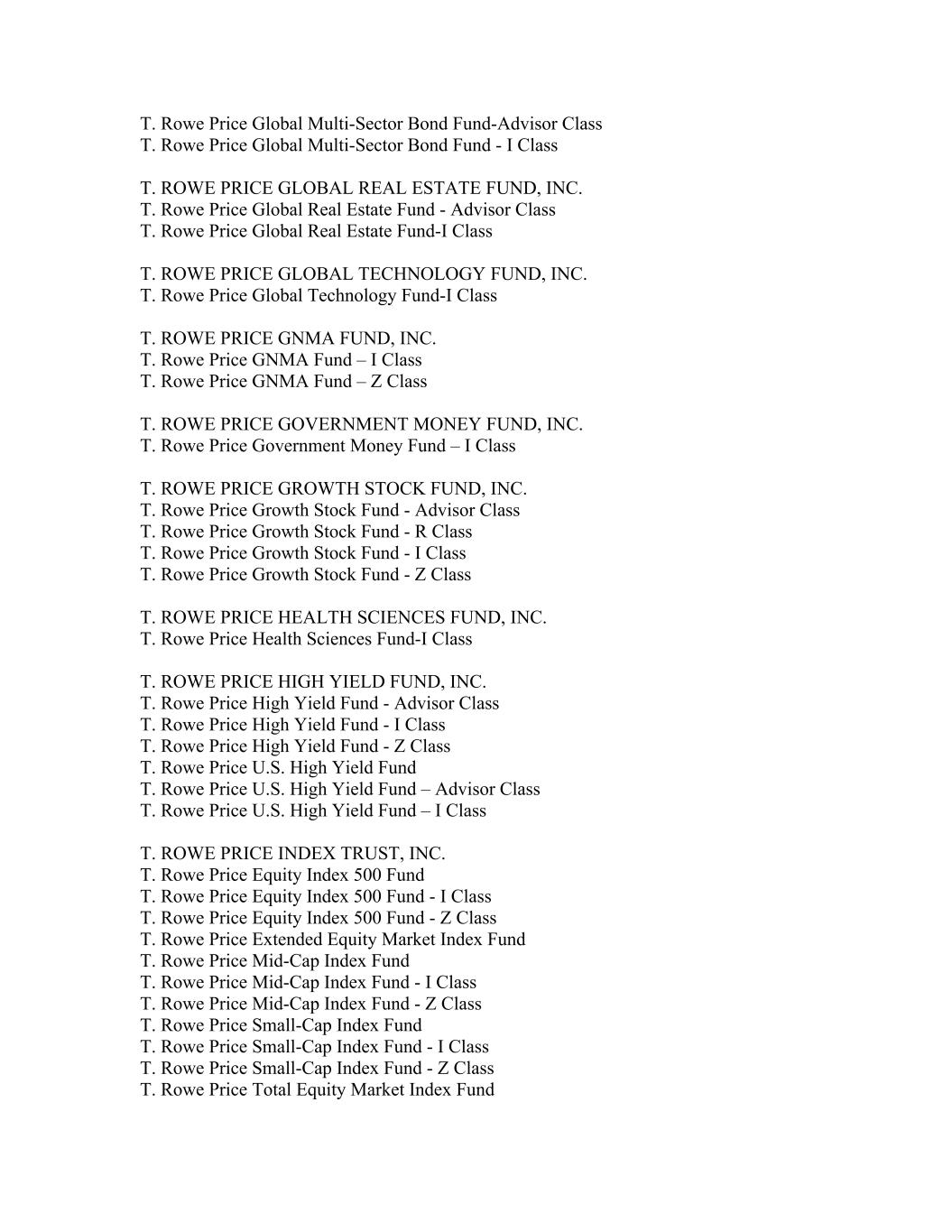 T. Rowe Price Global Multi-Sector Bond Fund-Advisor Class T. Rowe Price Global Multi-Sector Bond Fund - I Class T. ROWE PRICE GLOBAL REAL ESTATE FUND, INC. T. Rowe Price Global Real Estate Fund - Advisor Class T. Rowe Price Global Real Estate Fund-I Class T. ROWE PRICE GLOBAL TECHNOLOGY FUND, INC. T. Rowe Price Global Technology Fund-I Class T. ROWE PRICE GNMA FUND, INC. T. Rowe Price GNMA Fund – I Class T. Rowe Price GNMA Fund – Z Class T. ROWE PRICE GOVERNMENT MONEY FUND, INC. T. Rowe Price Government Money Fund – I Class T. ROWE PRICE GROWTH STOCK FUND, INC. T. Rowe Price Growth Stock Fund - Advisor Class T. Rowe Price Growth Stock Fund - R Class T. Rowe Price Growth Stock Fund - I Class T. Rowe Price Growth Stock Fund - Z Class T. ROWE PRICE HEALTH SCIENCES FUND, INC. T. Rowe Price Health Sciences Fund-I Class T. ROWE PRICE HIGH YIELD FUND, INC. T. Rowe Price High Yield Fund - Advisor Class T. Rowe Price High Yield Fund - I Class T. Rowe Price High Yield Fund - Z Class T. Rowe Price U.S. High Yield Fund T. Rowe Price U.S. High Yield Fund – Advisor Class T. Rowe Price U.S. High Yield Fund – I Class T. ROWE PRICE INDEX TRUST, INC. T. Rowe Price Equity Index 500 Fund T. Rowe Price Equity Index 500 Fund - I Class T. Rowe Price Equity Index 500 Fund - Z Class T. Rowe Price Extended Equity Market Index Fund T. Rowe Price Mid-Cap Index Fund T. Rowe Price Mid-Cap Index Fund - I Class T. Rowe Price Mid-Cap Index Fund - Z Class T. Rowe Price Small-Cap Index Fund T. Rowe Price Small-Cap Index Fund - I Class T. Rowe Price Small-Cap Index Fund - Z Class T. Rowe Price Total Equity Market Index Fund