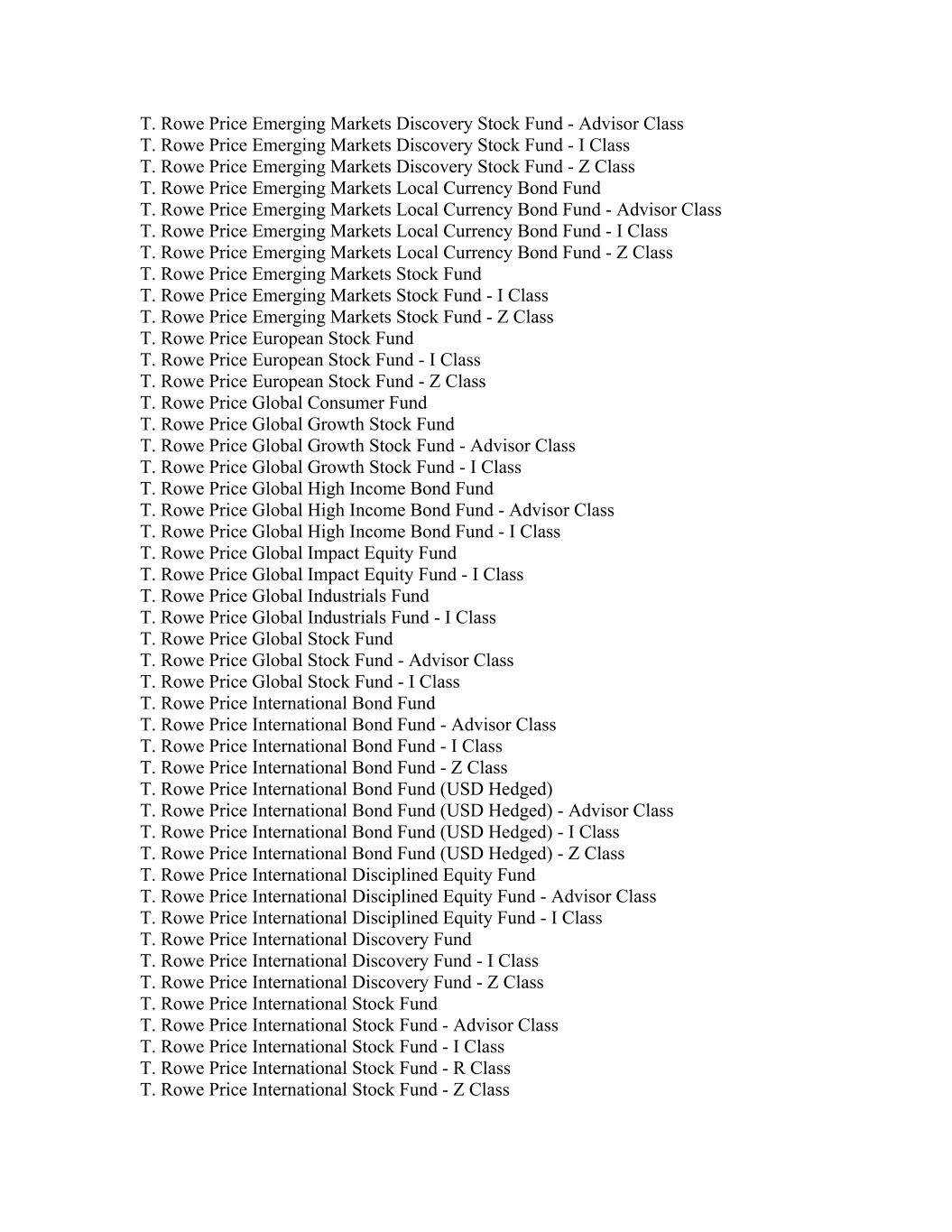 T. Rowe Price Emerging Markets Discovery Stock Fund - Advisor Class T. Rowe Price Emerging Markets Discovery Stock Fund - I Class T. Rowe Price Emerging Markets Discovery Stock Fund - Z Class T. Rowe Price Emerging Markets Local Currency Bond Fund T. Rowe Price Emerging Markets Local Currency Bond Fund - Advisor Class T. Rowe Price Emerging Markets Local Currency Bond Fund - I Class T. Rowe Price Emerging Markets Local Currency Bond Fund - Z Class T. Rowe Price Emerging Markets Stock Fund T. Rowe Price Emerging Markets Stock Fund - I Class T. Rowe Price Emerging Markets Stock Fund - Z Class T. Rowe Price European Stock Fund T. Rowe Price European Stock Fund - I Class T. Rowe Price European Stock Fund - Z Class T. Rowe Price Global Consumer Fund T. Rowe Price Global Growth Stock Fund T. Rowe Price Global Growth Stock Fund - Advisor Class T. Rowe Price Global Growth Stock Fund - I Class T. Rowe Price Global High Income Bond Fund T. Rowe Price Global High Income Bond Fund - Advisor Class T. Rowe Price Global High Income Bond Fund - I Class T. Rowe Price Global Impact Equity Fund T. Rowe Price Global Impact Equity Fund - I Class T. Rowe Price Global Industrials Fund T. Rowe Price Global Industrials Fund - I Class T. Rowe Price Global Stock Fund T. Rowe Price Global Stock Fund - Advisor Class T. Rowe Price Global Stock Fund - I Class T. Rowe Price International Bond Fund T. Rowe Price International Bond Fund - Advisor Class T. Rowe Price International Bond Fund - I Class T. Rowe Price International Bond Fund - Z Class T. Rowe Price International Bond Fund (USD Hedged) T. Rowe Price International Bond Fund (USD Hedged) - Advisor Class T. Rowe Price International Bond Fund (USD Hedged) - I Class T. Rowe Price International Bond Fund (USD Hedged) - Z Class T. Rowe Price International Disciplined Equity Fund T. Rowe Price International Disciplined Equity Fund - Advisor Class T. Rowe Price International Disciplined Equity Fund - I Class T. Rowe Price International Discovery Fund T. Rowe Price International Discovery Fund - I Class T. Rowe Price International Discovery Fund - Z Class T. Rowe Price International Stock Fund T. Rowe Price International Stock Fund - Advisor Class T. Rowe Price International Stock Fund - I Class T. Rowe Price International Stock Fund - R Class T. Rowe Price International Stock Fund - Z Class