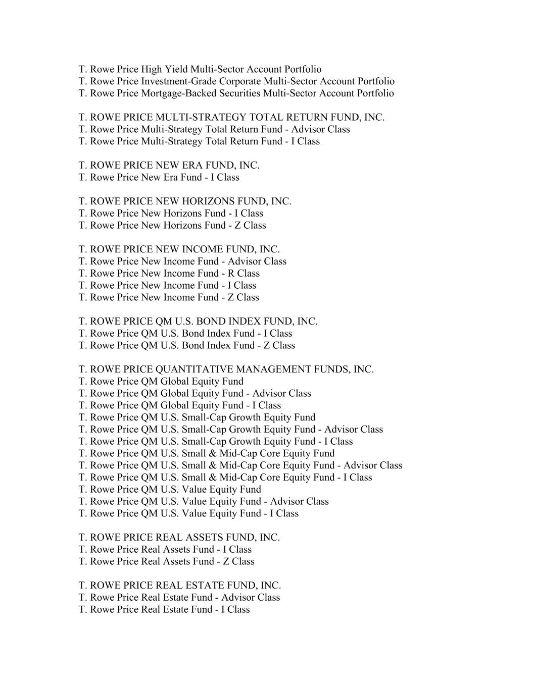 T. Rowe Price High Yield Multi-Sector Account Portfolio T. Rowe Price Investment-Grade Corporate Multi-Sector Account Portfolio T. Rowe Price Mortgage-Backed Securities Multi-Sector Account Portfolio T. ROWE PRICE MULTI-STRATEGY TOTAL RETURN FUND, INC. T. Rowe Price Multi-Strategy Total Return Fund - Advisor Class T. Rowe Price Multi-Strategy Total Return Fund - I Class T. ROWE PRICE NEW ERA FUND, INC. T. Rowe Price New Era Fund - I Class T. ROWE PRICE NEW HORIZONS FUND, INC. T. Rowe Price New Horizons Fund - I Class T. Rowe Price New Horizons Fund - Z Class T. ROWE PRICE NEW INCOME FUND, INC. T. Rowe Price New Income Fund - Advisor Class T. Rowe Price New Income Fund - R Class T. Rowe Price New Income Fund - I Class T. Rowe Price New Income Fund - Z Class T. ROWE PRICE QM U.S. BOND INDEX FUND, INC. T. Rowe Price QM U.S. Bond Index Fund - I Class T. Rowe Price QM U.S. Bond Index Fund - Z Class T. ROWE PRICE QUANTITATIVE MANAGEMENT FUNDS, INC. T. Rowe Price QM Global Equity Fund T. Rowe Price QM Global Equity Fund - Advisor Class T. Rowe Price QM Global Equity Fund - I Class T. Rowe Price QM U.S. Small-Cap Growth Equity Fund T. Rowe Price QM U.S. Small-Cap Growth Equity Fund - Advisor Class T. Rowe Price QM U.S. Small-Cap Growth Equity Fund - I Class T. Rowe Price QM U.S. Small & Mid-Cap Core Equity Fund T. Rowe Price QM U.S. Small & Mid-Cap Core Equity Fund - Advisor Class T. Rowe Price QM U.S. Small & Mid-Cap Core Equity Fund - I Class T. Rowe Price QM U.S. Value Equity Fund T. Rowe Price QM U.S. Value Equity Fund - Advisor Class T. Rowe Price QM U.S. Value Equity Fund - I Class T. ROWE PRICE REAL ASSETS FUND, INC. T. Rowe Price Real Assets Fund - I Class T. Rowe Price Real Assets Fund - Z Class T. ROWE PRICE REAL ESTATE FUND, INC. T. Rowe Price Real Estate Fund - Advisor Class T. Rowe Price Real Estate Fund - I Class