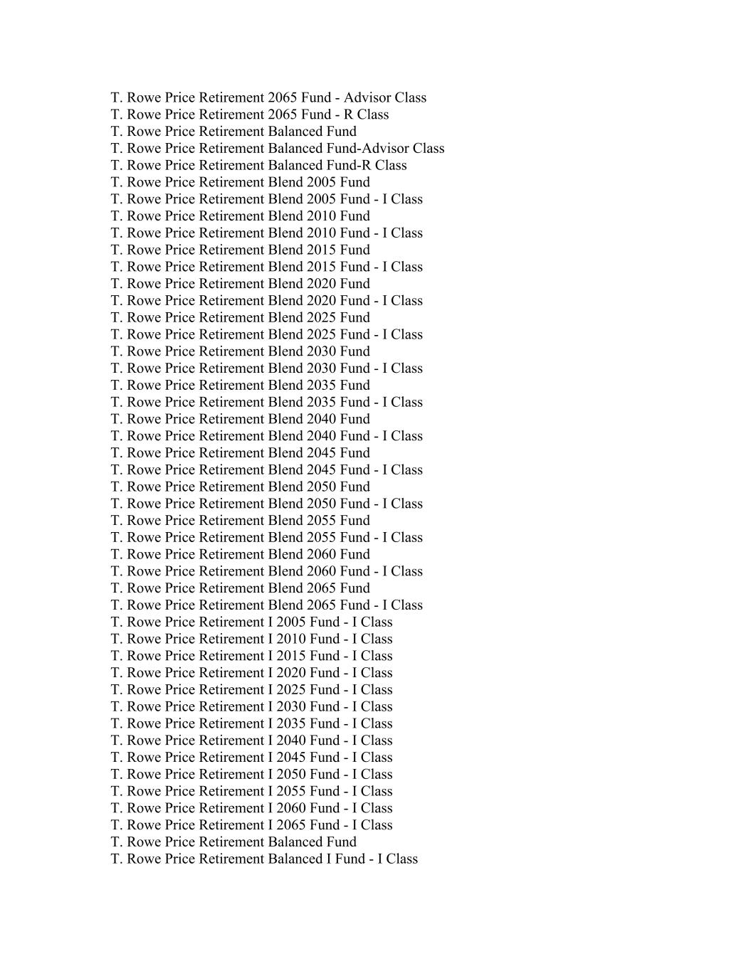 T. Rowe Price Retirement 2065 Fund - Advisor Class T. Rowe Price Retirement 2065 Fund - R Class T. Rowe Price Retirement Balanced Fund T. Rowe Price Retirement Balanced Fund-Advisor Class T. Rowe Price Retirement Balanced Fund-R Class T. Rowe Price Retirement Blend 2005 Fund T. Rowe Price Retirement Blend 2005 Fund - I Class T. Rowe Price Retirement Blend 2010 Fund T. Rowe Price Retirement Blend 2010 Fund - I Class T. Rowe Price Retirement Blend 2015 Fund T. Rowe Price Retirement Blend 2015 Fund - I Class T. Rowe Price Retirement Blend 2020 Fund T. Rowe Price Retirement Blend 2020 Fund - I Class T. Rowe Price Retirement Blend 2025 Fund T. Rowe Price Retirement Blend 2025 Fund - I Class T. Rowe Price Retirement Blend 2030 Fund T. Rowe Price Retirement Blend 2030 Fund - I Class T. Rowe Price Retirement Blend 2035 Fund T. Rowe Price Retirement Blend 2035 Fund - I Class T. Rowe Price Retirement Blend 2040 Fund T. Rowe Price Retirement Blend 2040 Fund - I Class T. Rowe Price Retirement Blend 2045 Fund T. Rowe Price Retirement Blend 2045 Fund - I Class T. Rowe Price Retirement Blend 2050 Fund T. Rowe Price Retirement Blend 2050 Fund - I Class T. Rowe Price Retirement Blend 2055 Fund T. Rowe Price Retirement Blend 2055 Fund - I Class T. Rowe Price Retirement Blend 2060 Fund T. Rowe Price Retirement Blend 2060 Fund - I Class T. Rowe Price Retirement Blend 2065 Fund T. Rowe Price Retirement Blend 2065 Fund - I Class T. Rowe Price Retirement I 2005 Fund - I Class T. Rowe Price Retirement I 2010 Fund - I Class T. Rowe Price Retirement I 2015 Fund - I Class T. Rowe Price Retirement I 2020 Fund - I Class T. Rowe Price Retirement I 2025 Fund - I Class T. Rowe Price Retirement I 2030 Fund - I Class T. Rowe Price Retirement I 2035 Fund - I Class T. Rowe Price Retirement I 2040 Fund - I Class T. Rowe Price Retirement I 2045 Fund - I Class T. Rowe Price Retirement I 2050 Fund - I Class T. Rowe Price Retirement I 2055 Fund - I Class T. Rowe Price Retirement I 2060 Fund - I Class T. Rowe Price Retirement I 2065 Fund - I Class T. Rowe Price Retirement Balanced Fund T. Rowe Price Retirement Balanced I Fund - I Class