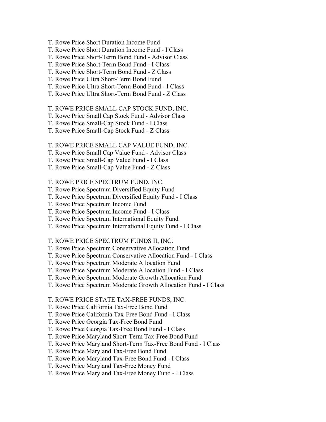 T. Rowe Price Short Duration Income Fund T. Rowe Price Short Duration Income Fund - I Class T. Rowe Price Short-Term Bond Fund - Advisor Class T. Rowe Price Short-Term Bond Fund - I Class T. Rowe Price Short-Term Bond Fund - Z Class T. Rowe Price Ultra Short-Term Bond Fund T. Rowe Price Ultra Short-Term Bond Fund - I Class T. Rowe Price Ultra Short-Term Bond Fund - Z Class T. ROWE PRICE SMALL CAP STOCK FUND, INC. T. Rowe Price Small Cap Stock Fund - Advisor Class T. Rowe Price Small-Cap Stock Fund - I Class T. Rowe Price Small-Cap Stock Fund - Z Class T. ROWE PRICE SMALL CAP VALUE FUND, INC. T. Rowe Price Small Cap Value Fund - Advisor Class T. Rowe Price Small-Cap Value Fund - I Class T. Rowe Price Small-Cap Value Fund - Z Class T. ROWE PRICE SPECTRUM FUND, INC. T. Rowe Price Spectrum Diversified Equity Fund T. Rowe Price Spectrum Diversified Equity Fund - I Class T. Rowe Price Spectrum Income Fund T. Rowe Price Spectrum Income Fund - I Class T. Rowe Price Spectrum International Equity Fund T. Rowe Price Spectrum International Equity Fund - I Class T. ROWE PRICE SPECTRUM FUNDS II, INC. T. Rowe Price Spectrum Conservative Allocation Fund T. Rowe Price Spectrum Conservative Allocation Fund - I Class T. Rowe Price Spectrum Moderate Allocation Fund T. Rowe Price Spectrum Moderate Allocation Fund - I Class T. Rowe Price Spectrum Moderate Growth Allocation Fund T. Rowe Price Spectrum Moderate Growth Allocation Fund - I Class T. ROWE PRICE STATE TAX-FREE FUNDS, INC. T. Rowe Price California Tax-Free Bond Fund T. Rowe Price California Tax-Free Bond Fund - I Class T. Rowe Price Georgia Tax-Free Bond Fund T. Rowe Price Georgia Tax-Free Bond Fund - I Class T. Rowe Price Maryland Short-Term Tax-Free Bond Fund T. Rowe Price Maryland Short-Term Tax-Free Bond Fund - I Class T. Rowe Price Maryland Tax-Free Bond Fund T. Rowe Price Maryland Tax-Free Bond Fund - I Class T. Rowe Price Maryland Tax-Free Money Fund T. Rowe Price Maryland Tax-Free Money Fund - I Class