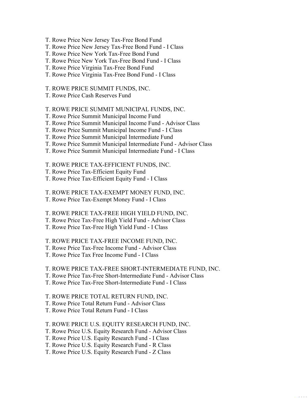 T. Rowe Price New Jersey Tax-Free Bond Fund T. Rowe Price New Jersey Tax-Free Bond Fund - I Class T. Rowe Price New York Tax-Free Bond Fund T. Rowe Price New York Tax-Free Bond Fund - I Class T. Rowe Price Virginia Tax-Free Bond Fund T. Rowe Price Virginia Tax-Free Bond Fund - I Class T. ROWE PRICE SUMMIT FUNDS, INC. T. Rowe Price Cash Reserves Fund T. ROWE PRICE SUMMIT MUNICIPAL FUNDS, INC. T. Rowe Price Summit Municipal Income Fund T. Rowe Price Summit Municipal Income Fund - Advisor Class T. Rowe Price Summit Municipal Income Fund - I Class T. Rowe Price Summit Municipal Intermediate Fund T. Rowe Price Summit Municipal Intermediate Fund - Advisor Class T. Rowe Price Summit Municipal Intermediate Fund - I Class T. ROWE PRICE TAX-EFFICIENT FUNDS, INC. T. Rowe Price Tax-Efficient Equity Fund T. Rowe Price Tax-Efficient Equity Fund - I Class T. ROWE PRICE TAX-EXEMPT MONEY FUND, INC. T. Rowe Price Tax-Exempt Money Fund - I Class T. ROWE PRICE TAX-FREE HIGH YIELD FUND, INC. T. Rowe Price Tax-Free High Yield Fund - Advisor Class T. Rowe Price Tax-Free High Yield Fund - I Class T. ROWE PRICE TAX-FREE INCOME FUND, INC. T. Rowe Price Tax-Free Income Fund - Advisor Class T. Rowe Price Tax Free Income Fund - I Class T. ROWE PRICE TAX-FREE SHORT-INTERMEDIATE FUND, INC. T. Rowe Price Tax-Free Short-Intermediate Fund - Advisor Class T. Rowe Price Tax-Free Short-Intermediate Fund - I Class T. ROWE PRICE TOTAL RETURN FUND, INC. T. Rowe Price Total Return Fund - Advisor Class T. Rowe Price Total Return Fund - I Class T. ROWE PRICE U.S. EQUITY RESEARCH FUND, INC. T. Rowe Price U.S. Equity Research Fund - Advisor Class T. Rowe Price U.S. Equity Research Fund - I Class T. Rowe Price U.S. Equity Research Fund - R Class T. Rowe Price U.S. Equity Research Fund - Z Class