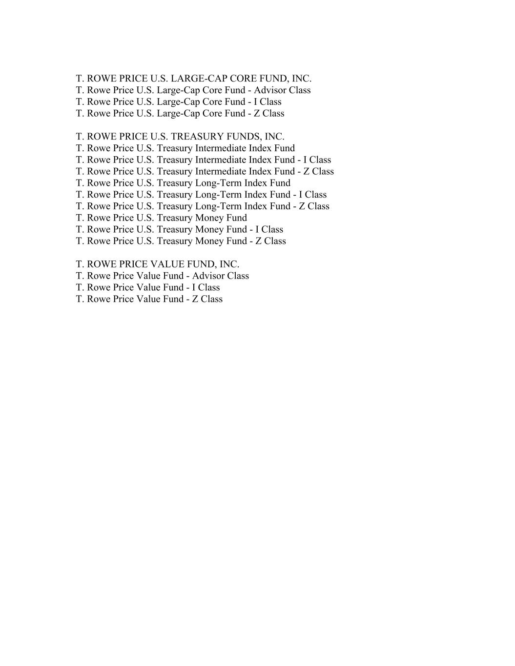 T. ROWE PRICE U.S. LARGE-CAP CORE FUND, INC. T. Rowe Price U.S. Large-Cap Core Fund - Advisor Class T. Rowe Price U.S. Large-Cap Core Fund - I Class T. Rowe Price U.S. Large-Cap Core Fund - Z Class T. ROWE PRICE U.S. TREASURY FUNDS, INC. T. Rowe Price U.S. Treasury Intermediate Index Fund T. Rowe Price U.S. Treasury Intermediate Index Fund - I Class T. Rowe Price U.S. Treasury Intermediate Index Fund - Z Class T. Rowe Price U.S. Treasury Long-Term Index Fund T. Rowe Price U.S. Treasury Long-Term Index Fund - I Class T. Rowe Price U.S. Treasury Long-Term Index Fund - Z Class T. Rowe Price U.S. Treasury Money Fund T. Rowe Price U.S. Treasury Money Fund - I Class T. Rowe Price U.S. Treasury Money Fund - Z Class T. ROWE PRICE VALUE FUND, INC. T. Rowe Price Value Fund - Advisor Class T. Rowe Price Value Fund - I Class T. Rowe Price Value Fund - Z Class