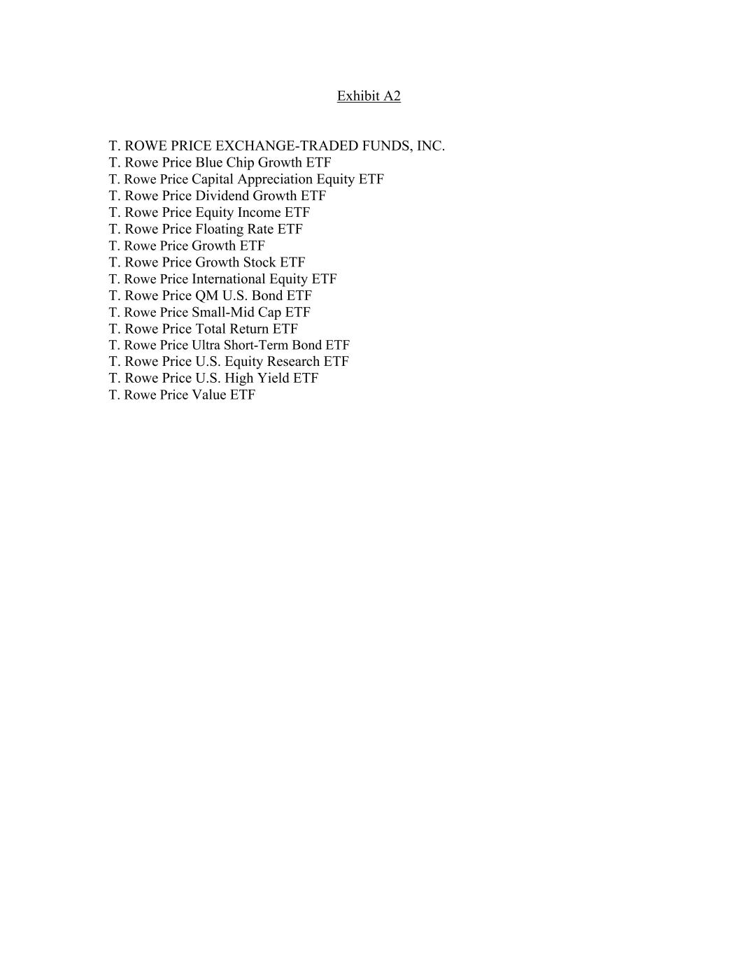 Exhibit A2 T. ROWE PRICE EXCHANGE-TRADED FUNDS, INC. T. Rowe Price Blue Chip Growth ETF T. Rowe Price Capital Appreciation Equity ETF T. Rowe Price Dividend Growth ETF T. Rowe Price Equity Income ETF T. Rowe Price Floating Rate ETF T. Rowe Price Growth ETF T. Rowe Price Growth Stock ETF T. Rowe Price International Equity ETF T. Rowe Price QM U.S. Bond ETF T. Rowe Price Small-Mid Cap ETF T. Rowe Price Total Return ETF T. Rowe Price Ultra Short-Term Bond ETF T. Rowe Price U.S. Equity Research ETF T. Rowe Price U.S. High Yield ETF T. Rowe Price Value ETF