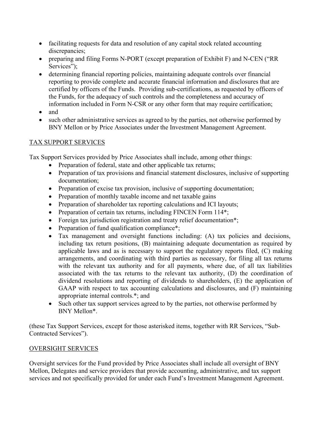 • facilitating requests for data and resolution of any capital stock related accounting discrepancies; • preparing and filing Forms N-PORT (except preparation of Exhibit F) and N-CEN (“RR Services”); • determining financial reporting policies, maintaining adequate controls over financial reporting to provide complete and accurate financial information and disclosures that are certified by officers of the Funds. Providing sub-certifications, as requested by officers of the Funds, for the adequacy of such controls and the completeness and accuracy of information included in Form N-CSR or any other form that may require certification; • and • such other administrative services as agreed to by the parties, not otherwise performed by BNY Mellon or by Price Associates under the Investment Management Agreement. TAX SUPPORT SERVICES Tax Support Services provided by Price Associates shall include, among other things: • Preparation of federal, state and other applicable tax returns; • Preparation of tax provisions and financial statement disclosures, inclusive of supporting documentation; • Preparation of excise tax provision, inclusive of supporting documentation; • Preparation of monthly taxable income and net taxable gains • Preparation of shareholder tax reporting calculations and ICI layouts; • Preparation of certain tax returns, including FINCEN Form 114*; • Foreign tax jurisdiction registration and treaty relief documentation*; • Preparation of fund qualification compliance*; • Tax management and oversight functions including: (A) tax policies and decisions, including tax return positions, (B) maintaining adequate documentation as required by applicable laws and as is necessary to support the regulatory reports filed, (C) making arrangements, and coordinating with third parties as necessary, for filing all tax returns with the relevant tax authority and for all payments, where due, of all tax liabilities associated with the tax returns to the relevant tax authority, (D) the coordination of dividend resolutions and reporting of dividends to shareholders, (E) the application of GAAP with respect to tax accounting calculations and disclosures, and (F) maintaining appropriate internal controls.*; and • Such other tax support services agreed to by the parties, not otherwise performed by BNY Mellon*. (these Tax Support Services, except for those asterisked items, together with RR Services, “Sub- Contracted Services”). OVERSIGHT SERVICES Oversight services for the Fund provided by Price Associates shall include all oversight of BNY Mellon, Delegates and service providers that provide accounting, administrative, and tax support services and not specifically provided for under each Fund’s Investment Management Agreement.