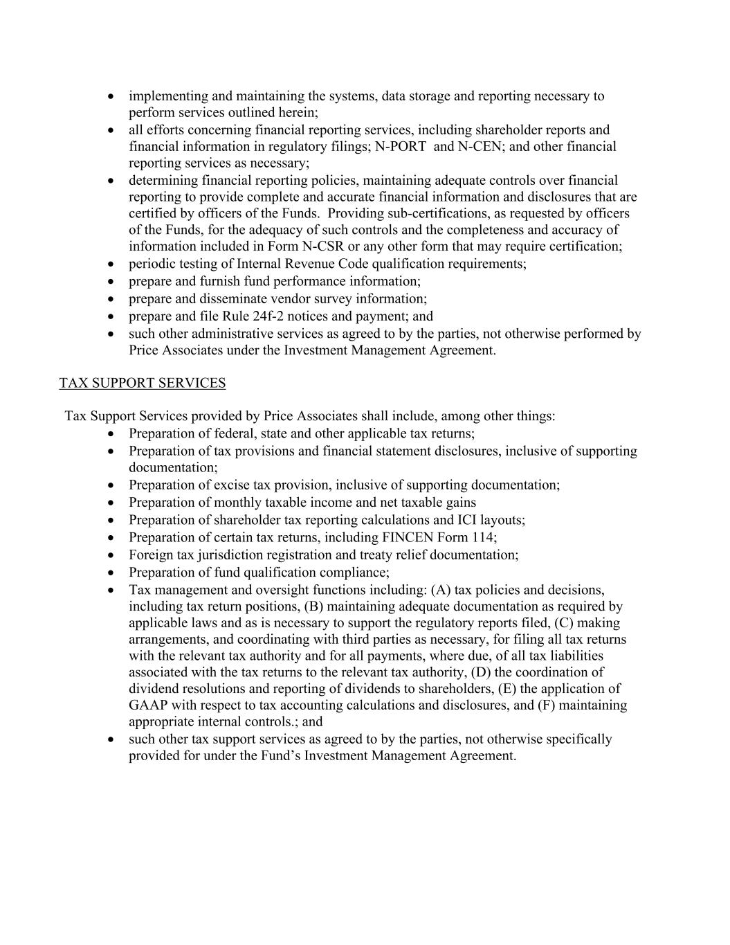 • implementing and maintaining the systems, data storage and reporting necessary to perform services outlined herein; • all efforts concerning financial reporting services, including shareholder reports and financial information in regulatory filings; N-PORT and N-CEN; and other financial reporting services as necessary; • determining financial reporting policies, maintaining adequate controls over financial reporting to provide complete and accurate financial information and disclosures that are certified by officers of the Funds. Providing sub-certifications, as requested by officers of the Funds, for the adequacy of such controls and the completeness and accuracy of information included in Form N-CSR or any other form that may require certification; • periodic testing of Internal Revenue Code qualification requirements; • prepare and furnish fund performance information; • prepare and disseminate vendor survey information; • prepare and file Rule 24f-2 notices and payment; and • such other administrative services as agreed to by the parties, not otherwise performed by Price Associates under the Investment Management Agreement. TAX SUPPORT SERVICES Tax Support Services provided by Price Associates shall include, among other things: • Preparation of federal, state and other applicable tax returns; • Preparation of tax provisions and financial statement disclosures, inclusive of supporting documentation; • Preparation of excise tax provision, inclusive of supporting documentation; • Preparation of monthly taxable income and net taxable gains • Preparation of shareholder tax reporting calculations and ICI layouts; • Preparation of certain tax returns, including FINCEN Form 114; • Foreign tax jurisdiction registration and treaty relief documentation; • Preparation of fund qualification compliance; • Tax management and oversight functions including: (A) tax policies and decisions, including tax return positions, (B) maintaining adequate documentation as required by applicable laws and as is necessary to support the regulatory reports filed, (C) making arrangements, and coordinating with third parties as necessary, for filing all tax returns with the relevant tax authority and for all payments, where due, of all tax liabilities associated with the tax returns to the relevant tax authority, (D) the coordination of dividend resolutions and reporting of dividends to shareholders, (E) the application of GAAP with respect to tax accounting calculations and disclosures, and (F) maintaining appropriate internal controls.; and • such other tax support services as agreed to by the parties, not otherwise specifically provided for under the Fund’s Investment Management Agreement.