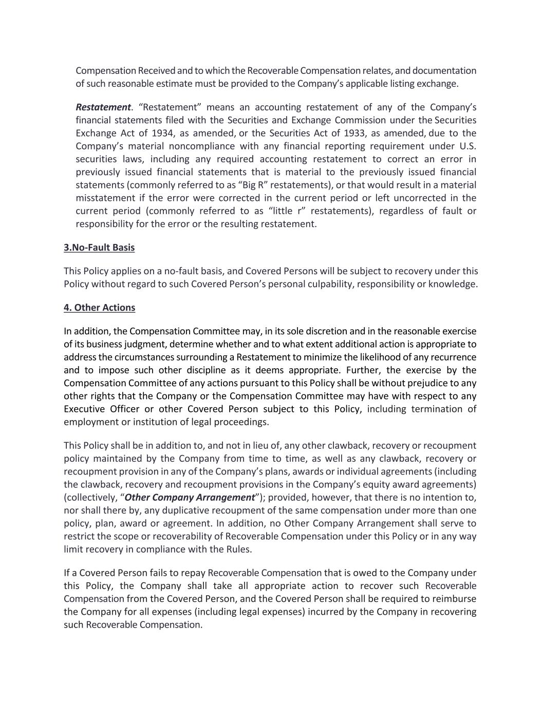 Compensation Received and to which the Recoverable Compensation relates, and documentation of such reasonable estimate must be provided to the Company’s applicable listing exchange. Restatement. “Restatement” means an accounting restatement of any of the Company’s financial statements filed with the Securities and Exchange Commission under the Securities Exchange Act of 1934, as amended, or the Securities Act of 1933, as amended, due to the Company’s material noncompliance with any financial reporting requirement under U.S. securities laws, including any required accounting restatement to correct an error in previously issued financial statements that is material to the previously issued financial statements (commonly referred to as “Big R” restatements), or that would result in a material misstatement if the error were corrected in the current period or left uncorrected in the current period (commonly referred to as “little r” restatements), regardless of fault or responsibility for the error or the resulting restatement. 3.No‐Fault Basis This Policy applies on a no‐fault basis, and Covered Persons will be subject to recovery under this Policy without regard to such Covered Person’s personal culpability, responsibility or knowledge. 4. Other Actions In addition, the Compensation Committee may, in its sole discretion and in the reasonable exercise of its business judgment, determine whether and to what extent additional action is appropriate to address the circumstances surrounding a Restatement to minimize the likelihood of any recurrence and to impose such other discipline as it deems appropriate. Further, the exercise by the Compensation Committee of any actions pursuant to this Policy shall be without prejudice to any other rights that the Company or the Compensation Committee may have with respect to any Executive Officer or other Covered Person subject to this Policy, including termination of employment or institution of legal proceedings. This Policy shall be in addition to, and not in lieu of, any other clawback, recovery or recoupment policy maintained by the Company from time to time, as well as any clawback, recovery or recoupment provision in any of the Company’s plans, awards or individual agreements (including the clawback, recovery and recoupment provisions in the Company’s equity award agreements) (collectively, “Other Company Arrangement”); provided, however, that there is no intention to, nor shall there by, any duplicative recoupment of the same compensation under more than one policy, plan, award or agreement. In addition, no Other Company Arrangement shall serve to restrict the scope or recoverability of Recoverable Compensation under this Policy or in any way limit recovery in compliance with the Rules. If a Covered Person fails to repay Recoverable Compensation that is owed to the Company under this Policy, the Company shall take all appropriate action to recover such Recoverable Compensation from the Covered Person, and the Covered Person shall be required to reimburse the Company for all expenses (including legal expenses) incurred by the Company in recovering such Recoverable Compensation.
