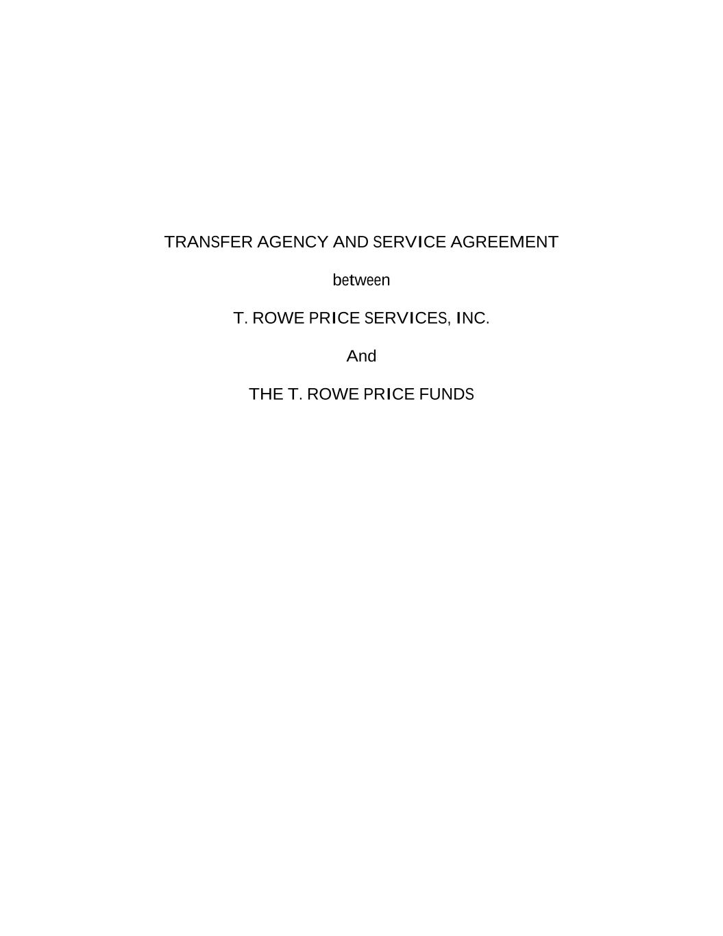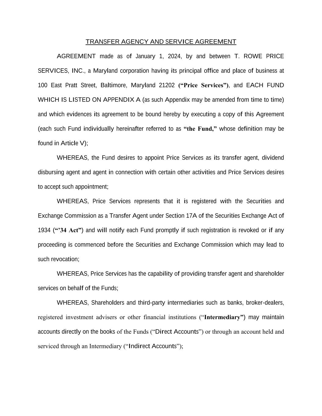 TRANSFER AGENCY AND SERVICE AGREEMENT AGREEMENT made as of January 1, 2024, by and between T. ROWE PRICE SERVICES, INC., a Maryland corporation having its principal office and place of business at 100 East Pratt Street, Baltimore, Maryland 21202 (“Price Services”), and EACH FUND WHICH IS LISTED ON APPENDIX A (as such Appendix may be amended from time to time) and which evidences its agreement to be bound hereby by executing a copy of this Agreement (each such Fund individually hereinafter referred to as “the Fund,” whose definition may be found in Article V); WHEREAS, the Fund desires to appoint Price Services as its transfer agent, dividend disbursing agent and agent in connection with certain other activities and Price Services desires to accept such appointment; WHEREAS, Price Services represents that it is registered with the Securities and Exchange Commission as a Transfer Agent under Section 17A of the Securities Exchange Act of 1934 (“’34 Act”) and will notify each Fund promptly if such registration is revoked or if any proceeding is commenced before the Securities and Exchange Commission which may lead to such revocation; WHEREAS, Price Services has the capability of providing transfer agent and shareholder services on behalf of the Funds; WHEREAS, Shareholders and third-party intermediaries such as banks, broker-dealers, registered investment advisers or other financial institutions (“Intermediary”) may maintain accounts directly on the books of the Funds (“Direct Accounts”) or through an account held and serviced through an Intermediary (“Indirect Accounts”);