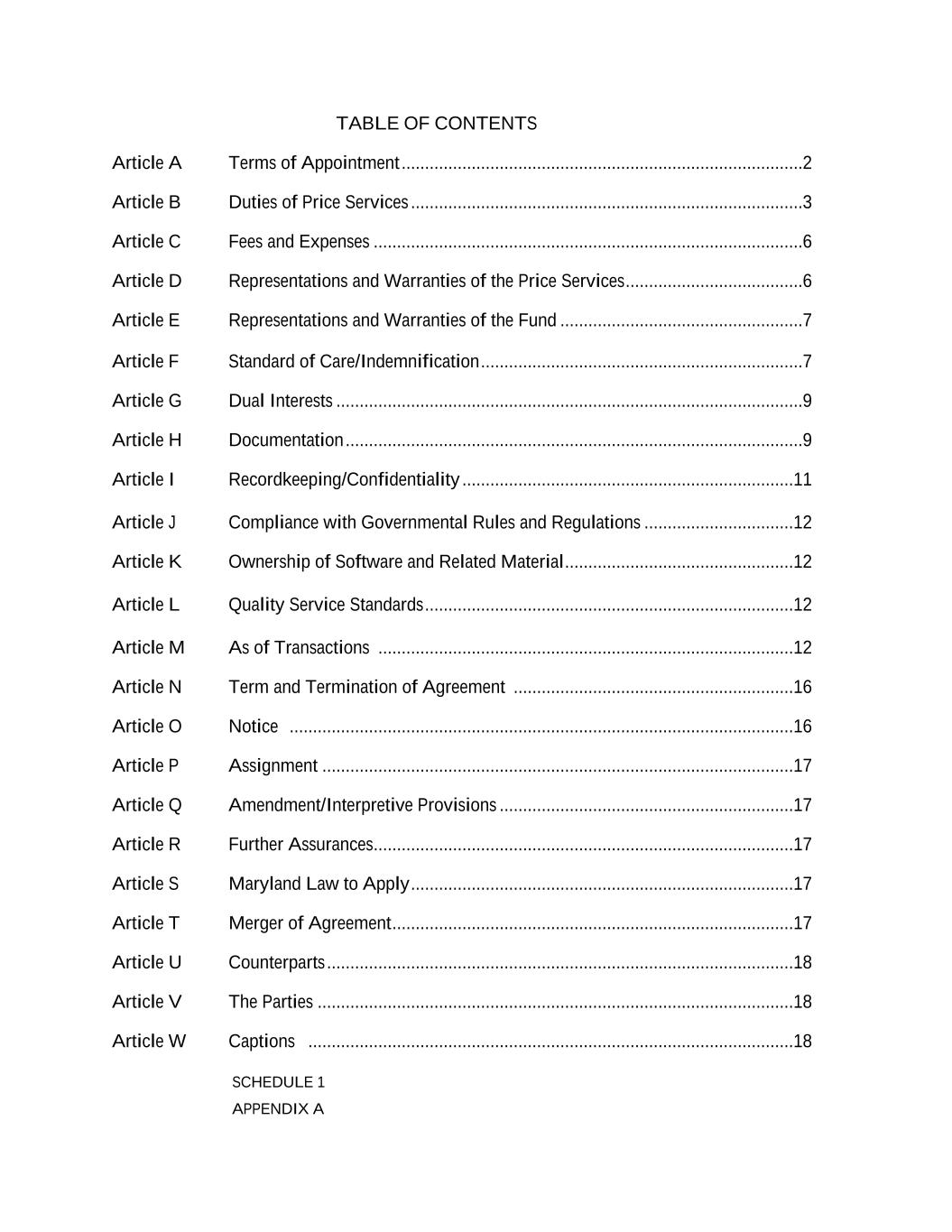 TABLE OF CONTENTS Article A Terms of Appointment ......................................................................................2 Article B Duties of Price Services ....................................................................................3 Article C Fees and Expenses ............................................................................................6 Article D Representations and Warranties of the Price Services ......................................6 Article E Representations and Warranties of the Fund ....................................................7 Article F Standard of Care/Indemnification .....................................................................7 Article G Dual Interests ....................................................................................................9 Article H Documentation ..................................................................................................9 Article I Recordkeeping/Confidentiality .......................................................................11 Article J Compliance with Governmental Rules and Regulations ................................12 Article K Ownership of Software and Related Material .................................................12 Article L Quality Service Standards ...............................................................................12 Article M As of Transactions .........................................................................................12 Article N Term and Termination of Agreement ............................................................16 Article O Notice ............................................................................................................16 Article P Assignment .....................................................................................................17 Article Q Amendment/Interpretive Provisions ...............................................................17 Article R Further Assurances ..........................................................................................17 Article S Maryland Law to Apply ..................................................................................17 Article T Merger of Agreement ......................................................................................17 Article U Counterparts ....................................................................................................18 Article V The Parties ......................................................................................................18 Article W Captions ........................................................................................................18 SCHEDULE 1 APPENDIX A