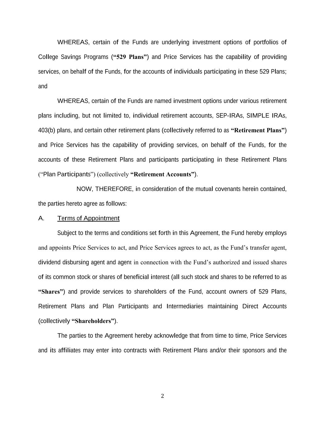 2 WHEREAS, certain of the Funds are underlying investment options of portfolios of College Savings Programs (“529 Plans”) and Price Services has the capability of providing services, on behalf of the Funds, for the accounts of individuals participating in these 529 Plans; and WHEREAS, certain of the Funds are named investment options under various retirement plans including, but not limited to, individual retirement accounts, SEP-IRAs, SIMPLE IRAs, 403(b) plans, and certain other retirement plans (collectively referred to as “Retirement Plans”) and Price Services has the capability of providing services, on behalf of the Funds, for the accounts of these Retirement Plans and participants participating in these Retirement Plans (“Plan Participants”) (collectively “Retirement Accounts”). NOW, THEREFORE, in consideration of the mutual covenants herein contained, the parties hereto agree as follows: A. Terms of Appointment Subject to the terms and conditions set forth in this Agreement, the Fund hereby employs and appoints Price Services to act, and Price Services agrees to act, as the Fund’s transfer agent, dividend disbursing agent and agent in connection with the Fund’s authorized and issued shares of its common stock or shares of beneficial interest (all such stock and shares to be referred to as “Shares”) and provide services to shareholders of the Fund, account owners of 529 Plans, Retirement Plans and Plan Participants and Intermediaries maintaining Direct Accounts (collectively “Shareholders”). The parties to the Agreement hereby acknowledge that from time to time, Price Services and its affiliates may enter into contracts with Retirement Plans and/or their sponsors and the