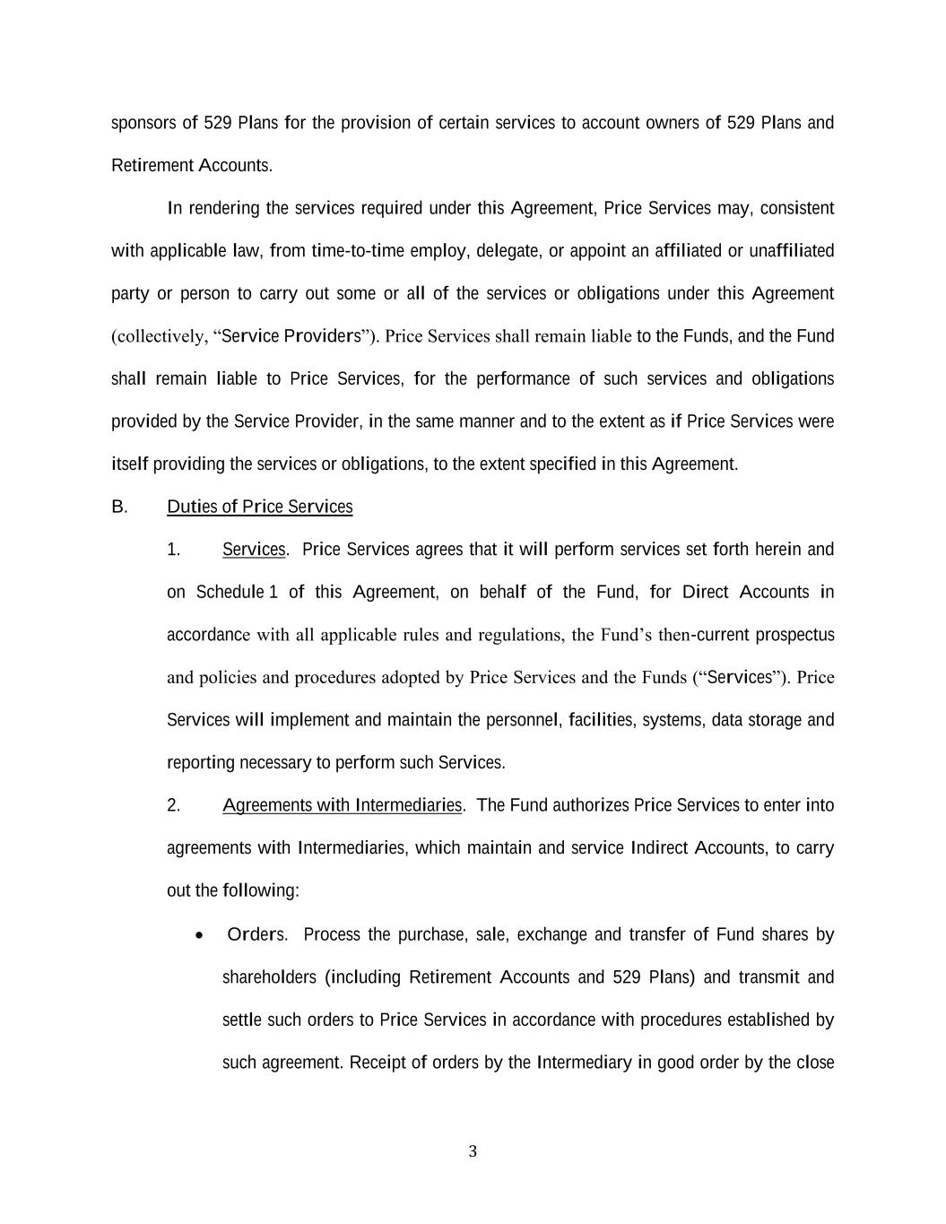 3 sponsors of 529 Plans for the provision of certain services to account owners of 529 Plans and Retirement Accounts. In rendering the services required under this Agreement, Price Services may, consistent with applicable law, from time-to-time employ, delegate, or appoint an affiliated or unaffiliated party or person to carry out some or all of the services or obligations under this Agreement (collectively, “Service Providers”). Price Services shall remain liable to the Funds, and the Fund shall remain liable to Price Services, for the performance of such services and obligations provided by the Service Provider, in the same manner and to the extent as if Price Services were itself providing the services or obligations, to the extent specified in this Agreement. B. Duties of Price Services 1. Services. Price Services agrees that it will perform services set forth herein and on Schedule 1 of this Agreement, on behalf of the Fund, for Direct Accounts in accordance with all applicable rules and regulations, the Fund’s then-current prospectus and policies and procedures adopted by Price Services and the Funds (“Services”). Price Services will implement and maintain the personnel, facilities, systems, data storage and reporting necessary to perform such Services. 2. Agreements with Intermediaries. The Fund authorizes Price Services to enter into agreements with Intermediaries, which maintain and service Indirect Accounts, to carry out the following: • Orders. Process the purchase, sale, exchange and transfer of Fund shares by shareholders (including Retirement Accounts and 529 Plans) and transmit and settle such orders to Price Services in accordance with procedures established by such agreement. Receipt of orders by the Intermediary in good order by the close