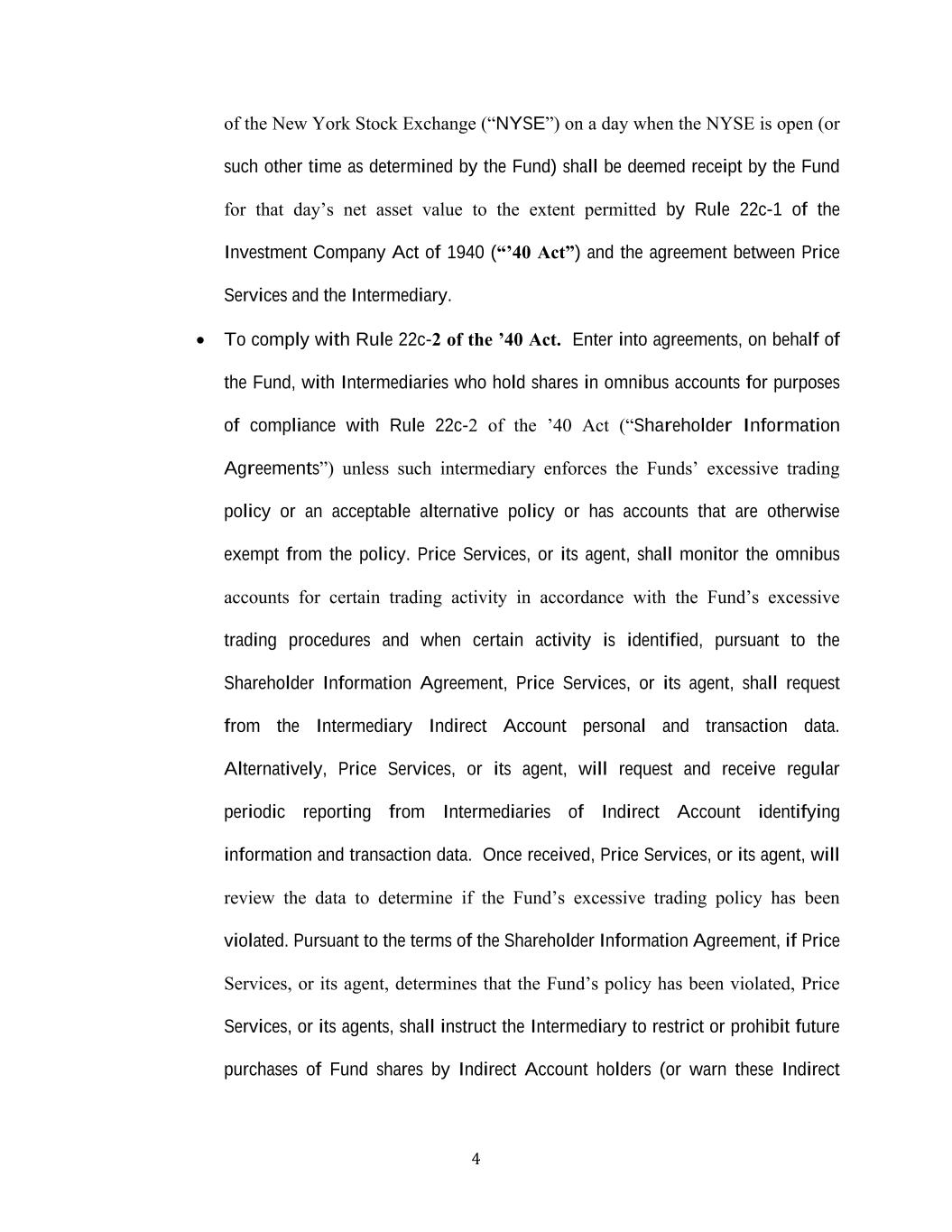 4 of the New York Stock Exchange (“NYSE”) on a day when the NYSE is open (or such other time as determined by the Fund) shall be deemed receipt by the Fund for that day’s net asset value to the extent permitted by Rule 22c-1 of the Investment Company Act of 1940 (“’40 Act”) and the agreement between Price Services and the Intermediary. • To comply with Rule 22c-2 of the ’40 Act. Enter into agreements, on behalf of the Fund, with Intermediaries who hold shares in omnibus accounts for purposes of compliance with Rule 22c-2 of the ’40 Act (“Shareholder Information Agreements”) unless such intermediary enforces the Funds’ excessive trading policy or an acceptable alternative policy or has accounts that are otherwise exempt from the policy. Price Services, or its agent, shall monitor the omnibus accounts for certain trading activity in accordance with the Fund’s excessive trading procedures and when certain activity is identified, pursuant to the Shareholder Information Agreement, Price Services, or its agent, shall request from the Intermediary Indirect Account personal and transaction data. Alternatively, Price Services, or its agent, will request and receive regular periodic reporting from Intermediaries of Indirect Account identifying information and transaction data. Once received, Price Services, or its agent, will review the data to determine if the Fund’s excessive trading policy has been violated. Pursuant to the terms of the Shareholder Information Agreement, if Price Services, or its agent, determines that the Fund’s policy has been violated, Price Services, or its agents, shall instruct the Intermediary to restrict or prohibit future purchases of Fund shares by Indirect Account holders (or warn these Indirect