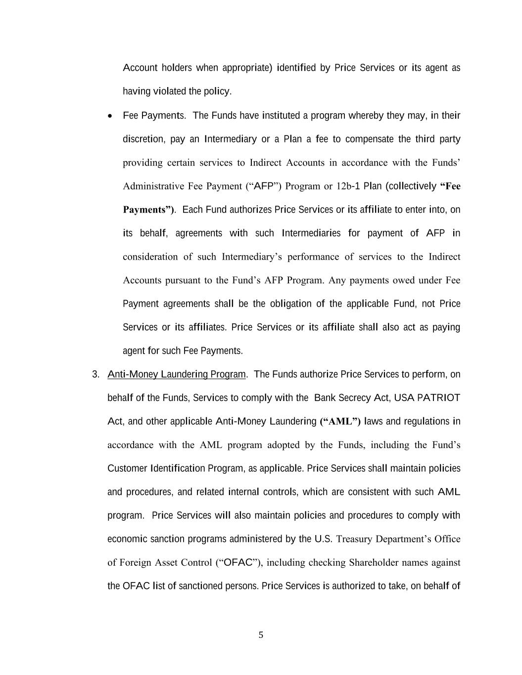 5 Account holders when appropriate) identified by Price Services or its agent as having violated the policy. • Fee Payments. The Funds have instituted a program whereby they may, in their discretion, pay an Intermediary or a Plan a fee to compensate the third party providing certain services to Indirect Accounts in accordance with the Funds’ Administrative Fee Payment (“AFP”) Program or 12b-1 Plan (collectively “Fee Payments”). Each Fund authorizes Price Services or its affiliate to enter into, on its behalf, agreements with such Intermediaries for payment of AFP in consideration of such Intermediary’s performance of services to the Indirect Accounts pursuant to the Fund’s AFP Program. Any payments owed under Fee Payment agreements shall be the obligation of the applicable Fund, not Price Services or its affiliates. Price Services or its affiliate shall also act as paying agent for such Fee Payments. 3. Anti-Money Laundering Program. The Funds authorize Price Services to perform, on behalf of the Funds, Services to comply with the Bank Secrecy Act, USA PATRIOT Act, and other applicable Anti-Money Laundering (“AML”) laws and regulations in accordance with the AML program adopted by the Funds, including the Fund’s Customer Identification Program, as applicable. Price Services shall maintain policies and procedures, and related internal controls, which are consistent with such AML program. Price Services will also maintain policies and procedures to comply with economic sanction programs administered by the U.S. Treasury Department’s Office of Foreign Asset Control (“OFAC”), including checking Shareholder names against the OFAC list of sanctioned persons. Price Services is authorized to take, on behalf of
