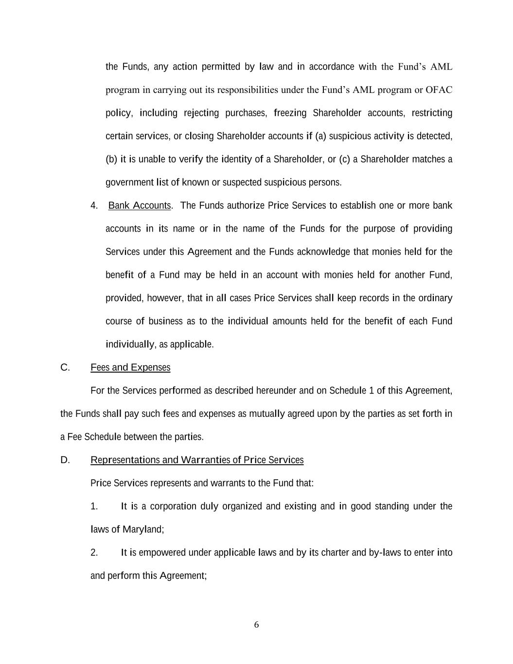 6 the Funds, any action permitted by law and in accordance with the Fund’s AML program in carrying out its responsibilities under the Fund’s AML program or OFAC policy, including rejecting purchases, freezing Shareholder accounts, restricting certain services, or closing Shareholder accounts if (a) suspicious activity is detected, (b) it is unable to verify the identity of a Shareholder, or (c) a Shareholder matches a government list of known or suspected suspicious persons. 4. Bank Accounts. The Funds authorize Price Services to establish one or more bank accounts in its name or in the name of the Funds for the purpose of providing Services under this Agreement and the Funds acknowledge that monies held for the benefit of a Fund may be held in an account with monies held for another Fund, provided, however, that in all cases Price Services shall keep records in the ordinary course of business as to the individual amounts held for the benefit of each Fund individually, as applicable. C. Fees and Expenses For the Services performed as described hereunder and on Schedule 1 of this Agreement, the Funds shall pay such fees and expenses as mutually agreed upon by the parties as set forth in a Fee Schedule between the parties. D. Representations and Warranties of Price Services Price Services represents and warrants to the Fund that: 1. It is a corporation duly organized and existing and in good standing under the laws of Maryland; 2. It is empowered under applicable laws and by its charter and by-laws to enter into and perform this Agreement;