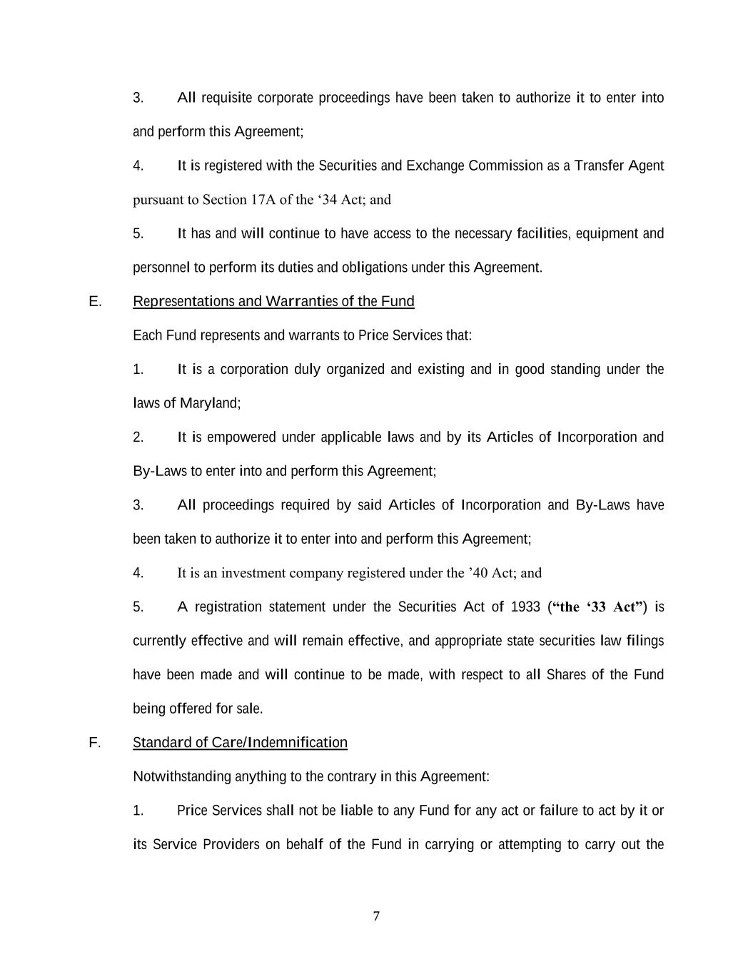 7 3. All requisite corporate proceedings have been taken to authorize it to enter into and perform this Agreement; 4. It is registered with the Securities and Exchange Commission as a Transfer Agent pursuant to Section 17A of the ‘34 Act; and 5. It has and will continue to have access to the necessary facilities, equipment and personnel to perform its duties and obligations under this Agreement. E. Representations and Warranties of the Fund Each Fund represents and warrants to Price Services that: 1. It is a corporation duly organized and existing and in good standing under the laws of Maryland; 2. It is empowered under applicable laws and by its Articles of Incorporation and By-Laws to enter into and perform this Agreement; 3. All proceedings required by said Articles of Incorporation and By-Laws have been taken to authorize it to enter into and perform this Agreement; 4. It is an investment company registered under the ’40 Act; and 5. A registration statement under the Securities Act of 1933 (“the ‘33 Act”) is currently effective and will remain effective, and appropriate state securities law filings have been made and will continue to be made, with respect to all Shares of the Fund being offered for sale. F. Standard of Care/Indemnification Notwithstanding anything to the contrary in this Agreement: 1. Price Services shall not be liable to any Fund for any act or failure to act by it or its Service Providers on behalf of the Fund in carrying or attempting to carry out the