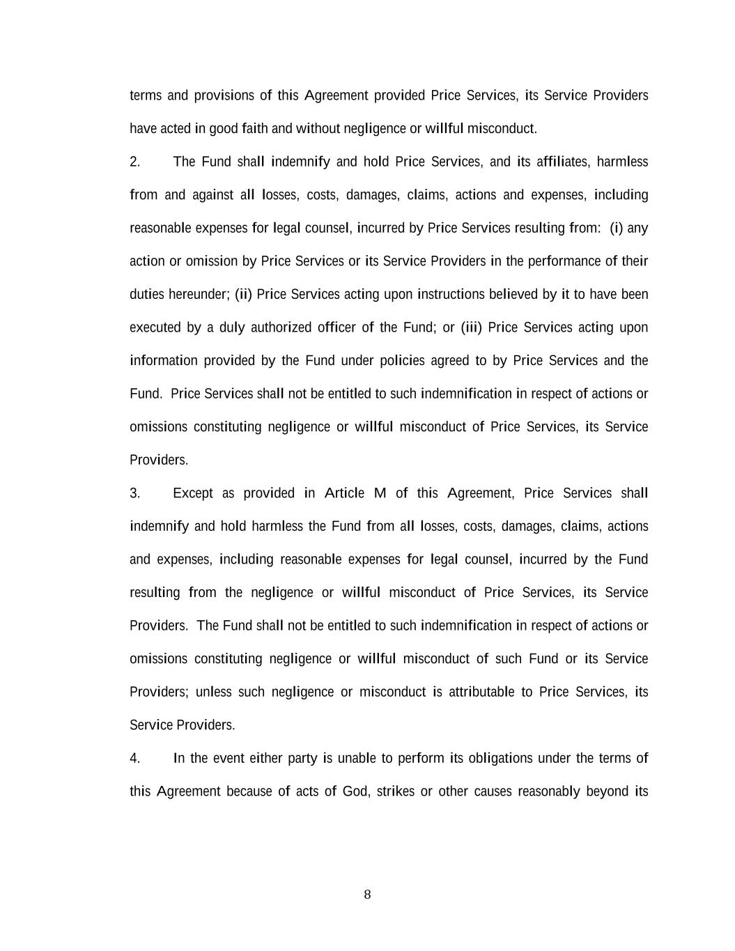 8 terms and provisions of this Agreement provided Price Services, its Service Providers have acted in good faith and without negligence or willful misconduct. 2. The Fund shall indemnify and hold Price Services, and its affiliates, harmless from and against all losses, costs, damages, claims, actions and expenses, including reasonable expenses for legal counsel, incurred by Price Services resulting from: (i) any action or omission by Price Services or its Service Providers in the performance of their duties hereunder; (ii) Price Services acting upon instructions believed by it to have been executed by a duly authorized officer of the Fund; or (iii) Price Services acting upon information provided by the Fund under policies agreed to by Price Services and the Fund. Price Services shall not be entitled to such indemnification in respect of actions or omissions constituting negligence or willful misconduct of Price Services, its Service Providers. 3. Except as provided in Article M of this Agreement, Price Services shall indemnify and hold harmless the Fund from all losses, costs, damages, claims, actions and expenses, including reasonable expenses for legal counsel, incurred by the Fund resulting from the negligence or willful misconduct of Price Services, its Service Providers. The Fund shall not be entitled to such indemnification in respect of actions or omissions constituting negligence or willful misconduct of such Fund or its Service Providers; unless such negligence or misconduct is attributable to Price Services, its Service Providers. 4. In the event either party is unable to perform its obligations under the terms of this Agreement because of acts of God, strikes or other causes reasonably beyond its