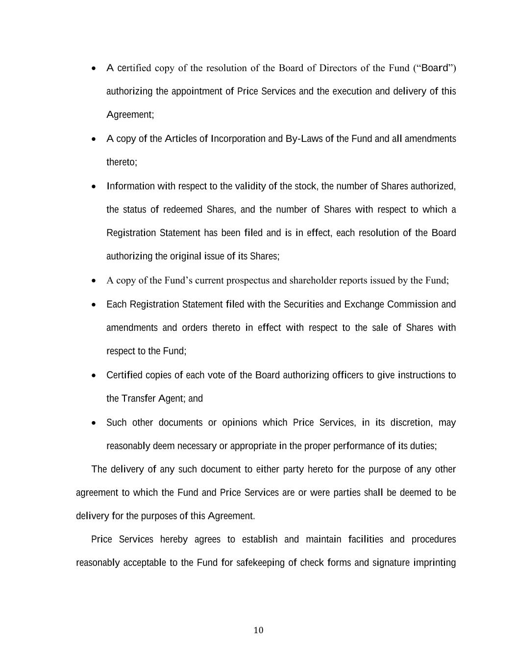 10 • A certified copy of the resolution of the Board of Directors of the Fund (“Board”) authorizing the appointment of Price Services and the execution and delivery of this Agreement; • A copy of the Articles of Incorporation and By-Laws of the Fund and all amendments thereto; • Information with respect to the validity of the stock, the number of Shares authorized, the status of redeemed Shares, and the number of Shares with respect to which a Registration Statement has been filed and is in effect, each resolution of the Board authorizing the original issue of its Shares; • A copy of the Fund’s current prospectus and shareholder reports issued by the Fund; • Each Registration Statement filed with the Securities and Exchange Commission and amendments and orders thereto in effect with respect to the sale of Shares with respect to the Fund; • Certified copies of each vote of the Board authorizing officers to give instructions to the Transfer Agent; and • Such other documents or opinions which Price Services, in its discretion, may reasonably deem necessary or appropriate in the proper performance of its duties; The delivery of any such document to either party hereto for the purpose of any other agreement to which the Fund and Price Services are or were parties shall be deemed to be delivery for the purposes of this Agreement. Price Services hereby agrees to establish and maintain facilities and procedures reasonably acceptable to the Fund for safekeeping of check forms and signature imprinting